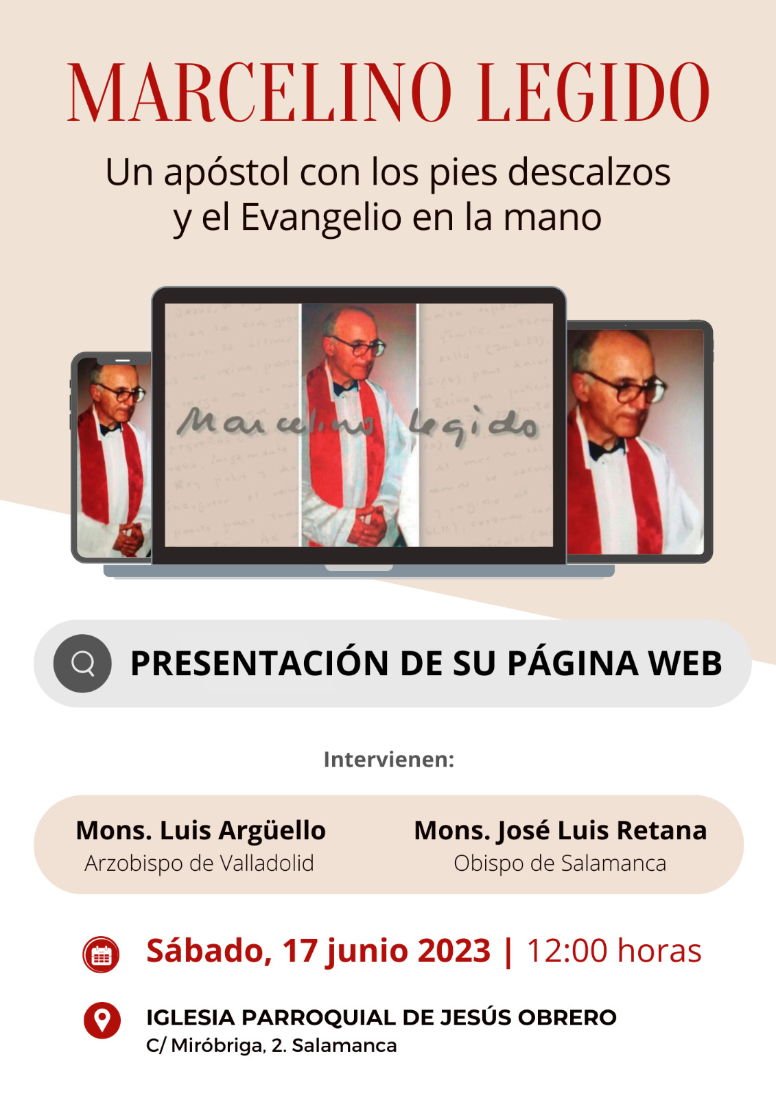 La Web de Marcelino Legido, que se va a presentar, es el comienzo de una empresa que ha de tener un recorrido extenso y profundo a lo largo de los años venideros. Se trata de un primer acercamiento, con distintos apartados para rastrear su BIOGRAFÍA, su LEGADO ESPIRITUAL, sus EJERCICIOS ESPITIRUALES para sacerdotes impartidos en Villagarcía de Campos (Valladolid), sus OBRAS PUBLICADAS, sus OBRAS NO PUBLICADAS, sus CARTAS, y el último de ellos titulado: CON LOS PIES DESCALZOS Y EL EVANGELIO EN LA MANO, para recoger el eco que ha originado su vida y su camino, con publicaciones sobre él y testimonios grabados, junto con escritos suyos, breves, bellos y profundos, que regalaba sobreabundantemente y de manera especial a los pobres y sencillos, mientras iba de camino, como “tomillos arrojados al paso del Señor”.