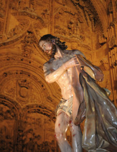 Las puertas de la Clerecía se abren cada Miércoles Santo para recibir a las dos imágenes de la Hermandad de Nuestro Padre Jesús Flagelado. La talla de Luis Salvador Carmona, custodiada por unos angelitos, sale con su manto de la mano de sus hermanos de carga. Detrás, la Virgen de las Lágrimas, obra de José Miguel Sánchez Peña.