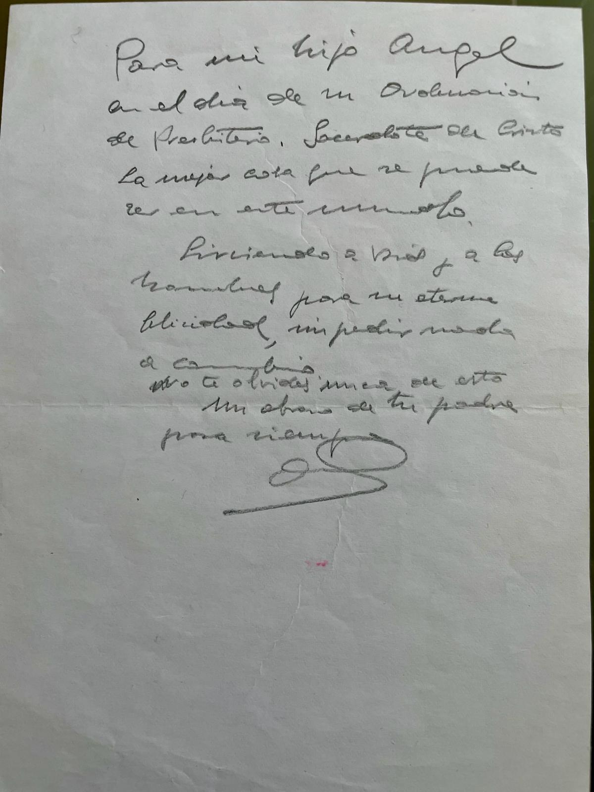 Un año antes de su ordenación como presbítero, Ángel Cordovilla recibió un legado muy valioso de su padre, quien falleció en 1998 dejándole escritas unas palabras que resonarán en su corazón para siempre: “Para mi hijo Ángel, en el día de su ordenación de presbítero. Sacerdote de Cristo, la mejor cosa que se puede ser en este mundo, sirviendo a Dios y a los hombres, para su eterna felicidad, sin pedir nada a cambio. No te olvides nunca de esto. Un abrazo de tu padre para siempre”.