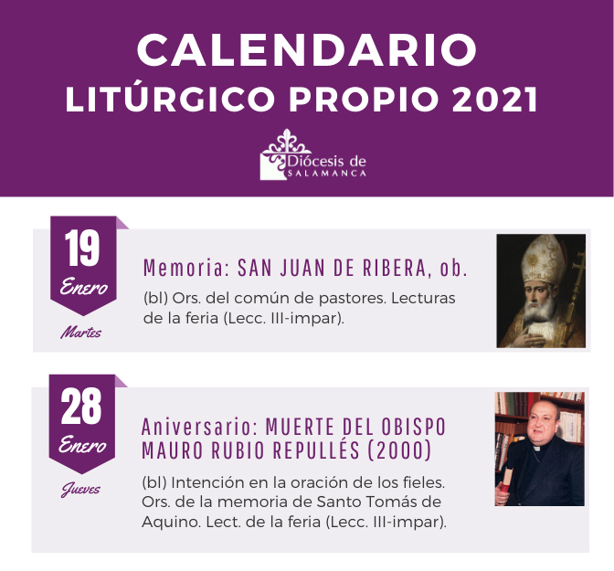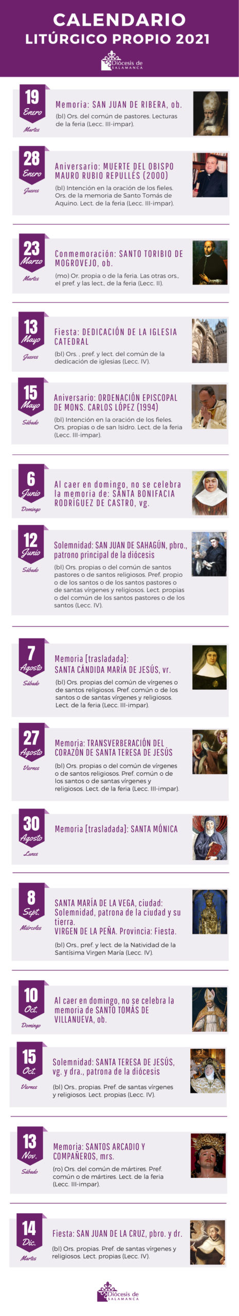 Cada una de las diócesis que forma la Iglesia Universal tiene un calendario de días litúrgicos propios. Recuerdan a los santos que tuvieron una relación estrecha con la diócesis, o celebran otras circunstancias particulares. En la diócesis de Salamanca son catorce días que componen este calendario. En él se detallan las fiestas y memorias propias, que se añaden a las ya existentes en el Calendario Litúrgico General de la Iglesia Universal y de España.