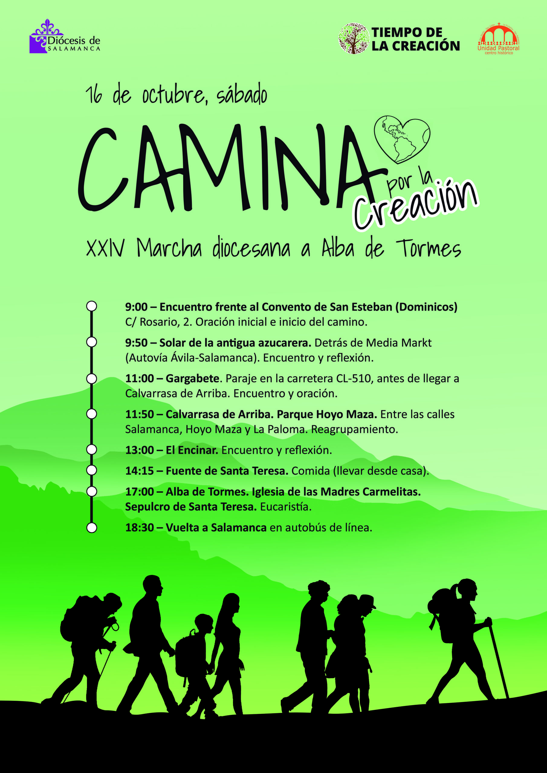 Este camino de peregrinación comenzará a las 9:00 de la mañana frente al Convento de San Esteban, donde se congregarán todos los que lo deseen “para salir todos juntos” hacia Alba de Tormes, como precisa Julia Blázquez. El itinerario contempla seis paradas en las que los peregrinos compartirán momentos de encuentro, oración y reflexión. “Caminaremos juntos, oraremos, en la fuente de Santa Teresa, compartiremos la comida que cada uno traerá de su casa y celebraremos la eucaristía junto a la Santa”, avanza esta responsable del grupo Laudato Si’.