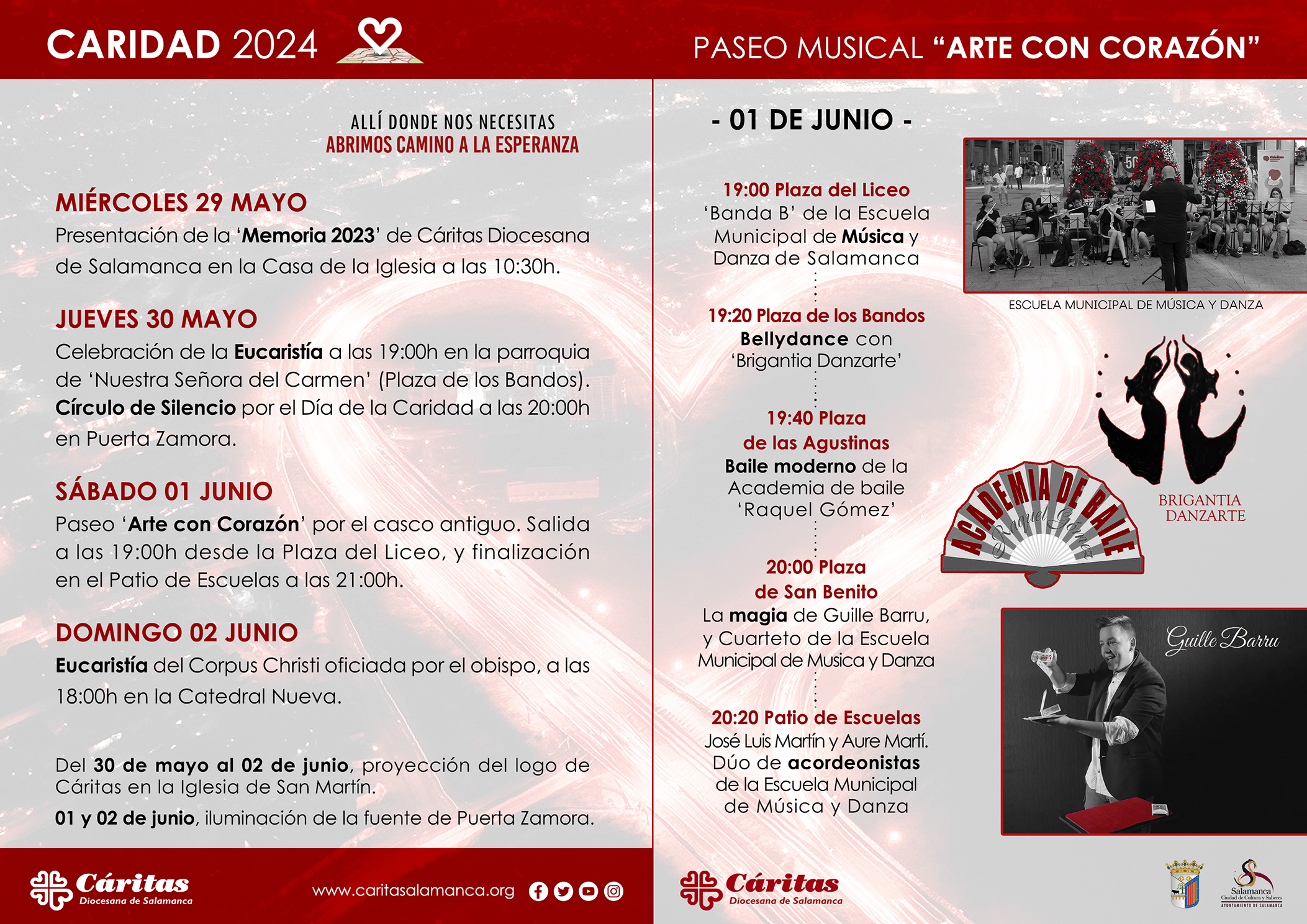 Además, el sábado 1 de junio llevará a cabo su tradicional Paseo “Arte con corazón” por el casco antiguo de la ciudad, que se iniciará en la Plaza del Liceo, a las 19:00 horas y concluirá dos horas después en el Patio de Escuelas. Un acto que contará con diferentes espectáculos de música, danza y magia.