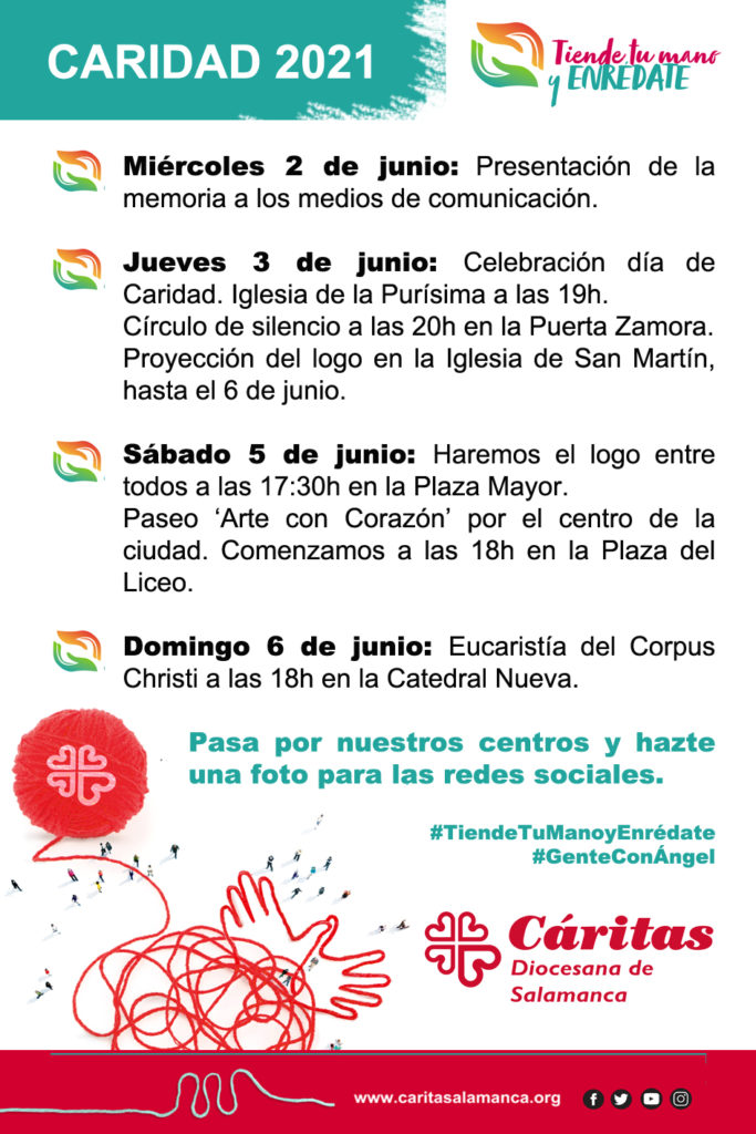 “Tiende tu mano y enrédate”, es el lema de este año de la campaña institucional de Cáritas para el Día de la Caridad que la institución diocesana ha presentado este miércoles, 2 de junio, junto con la Memoria de su actividad durante el 2020. Un año marcado por la pandemia que ha sido “difícil, especialmente para las personas más vulnerables” y en el que la institución ha tenido que modificar su “hacer” y “estar” para poder acompañarlas, especialmente durante el periodo de confinamiento, como ha precisado el secretario general de la institución José María Rodríguez.