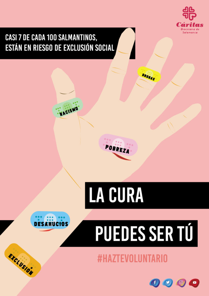 El lema “La cura puede ser tú” centra una nueva campaña de voluntariado de Cáritas diocesana de Salamanca, que pretende ser una invitación a emplear parte del tiempo en actividades de voluntariado. Como apunta la responsable del departamento de voluntariado de la organización diocesana, Rosa Hernández, “en esta iniciativa mostramos al voluntario como una tirita para curar una herida, con un gesto sencillo, pero no menos importante, porque cada tarea que hace es importante para esta casa”.