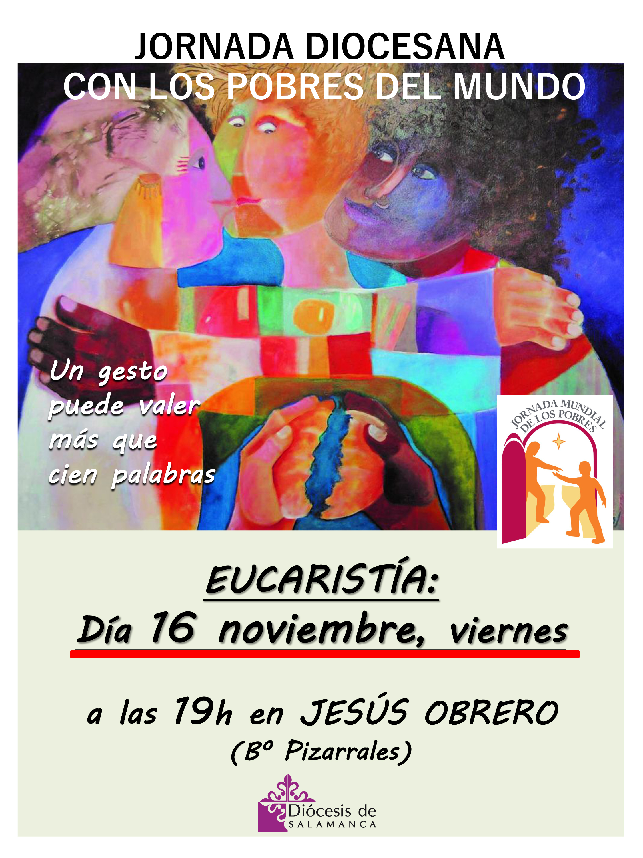 En respuesta a este llamamiento del Papa, y unidos a la Iglesia universal, la Diócesis de Salamanca convoca a toda la comunidad diocesana a participar en la eucaristía que tendrá lugar el viernes 16 de noviembre, a las 19.00 horas en la parroquia de Jesús Obrero, en el Barrio de Pizarrales.