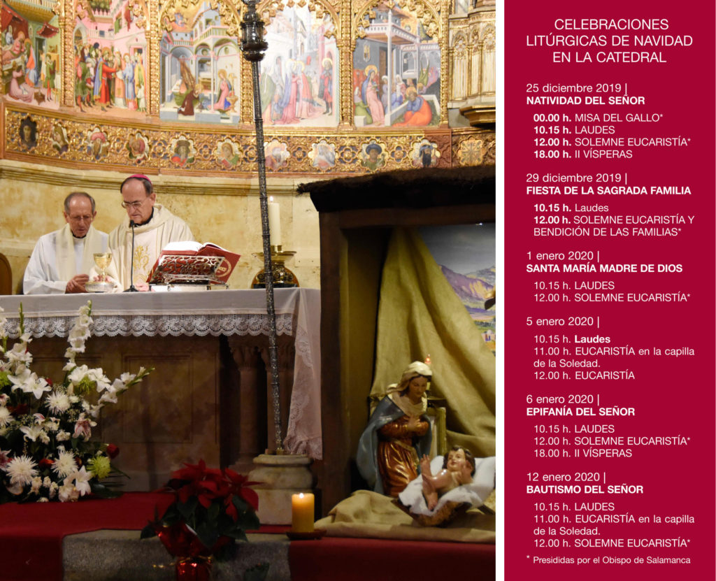 El Obispo de Salamanca, D. Carlos López Hernández, presidirá las principales celebraciones de litúrgicas de Navidad en la Catedral Vieja, que darán comienzo el 24 de diciembre, a las 24.00 horas con la Misa del Gallo. Al día siguiente, miércoles 25 de diciembre oficiará la Eucaristía en la Fiesta de la Natividad del Señor, a las 12.00 del mediodía. Ese día además habrá rezo de Laudes a las 10.15 de la mañana y Oración de II Vísperas, a las 18.00 horas, al igual que el 6 de enero.