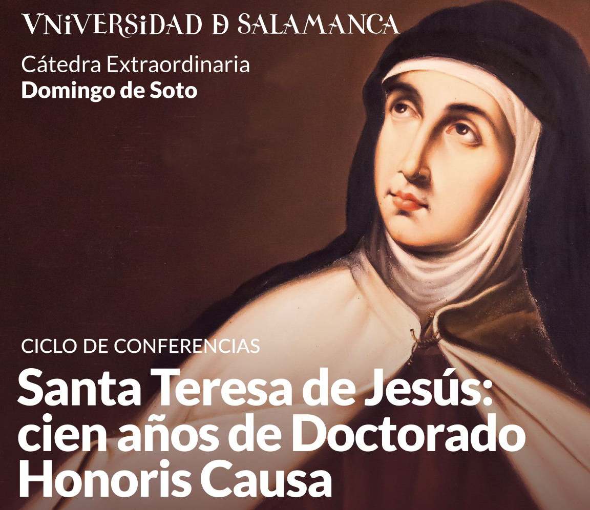 Con motivo de esta conmemoración, la Cátedra extraordinaria Domingo de Soto de la Universidad de Salamanca promueve el ciclo de cuatro conferencias: “Santa Teresa de Jesús: cien años del Doctorado Honoris Causa”, que comenzará el próximo jueves, 20 de abril, y se prolongará hasta el 11 de mayo. Las ponencias tendrán lugar a las 19:30 horas en el Aula Miguel de Unamuno del Edificio Histórico de la Universidad. La entrada es libre hasta completar aforo.