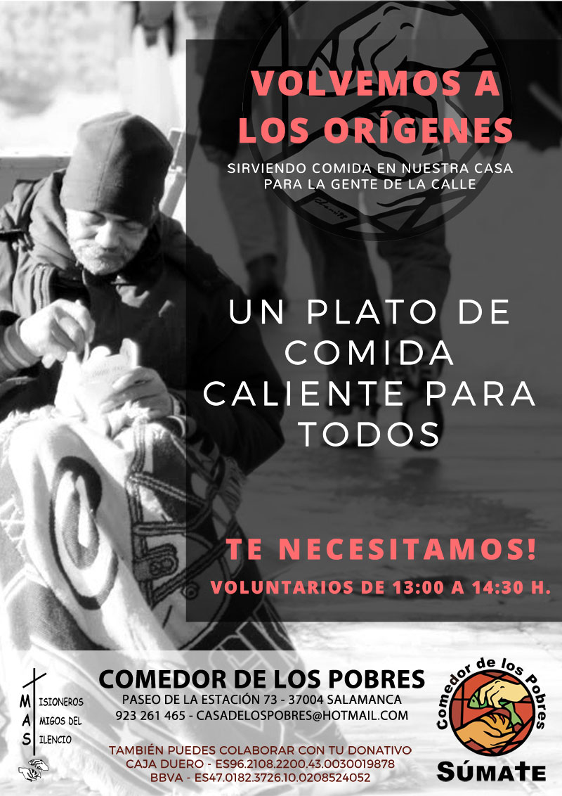 Este comedor social abrió sus puertas en Salamanca en 1994 de la mano de los Misioneros Amigos del Silencio. Desde entonces han ido ampliando sus actividades y servicios en beneficio de los más necesitados. Al reparto de lotes de alimentos, distribución de menús envasados; acogida; atención integral a familias y ayuda psicológica, este año han ofertado por primera vez la impartición de clases de apoyo a niños y adolescentes y han vuelto a sus orígenes recuperando el servicio de comida caliente a personas sin hogar.