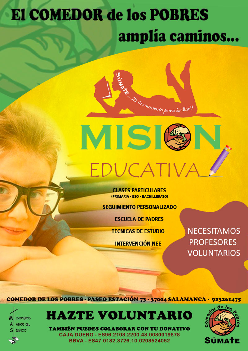 Los nuevos proyectos impulsados este año por el Comedor de los Pobres: ‘Misión Educativa’ y ‘Un plato de comida caliente para todas las personas sin hogar’, siguen necesitando voluntarios. Para el primero, ‘Misión Educativa’ se requieren personas cualificadas que se encarguen de impartir clases particulares a niños, principalmente de ESO pero también de Primaria y Bachillerato, de lunes a viernes, de 17.30 a 19.00 horas.