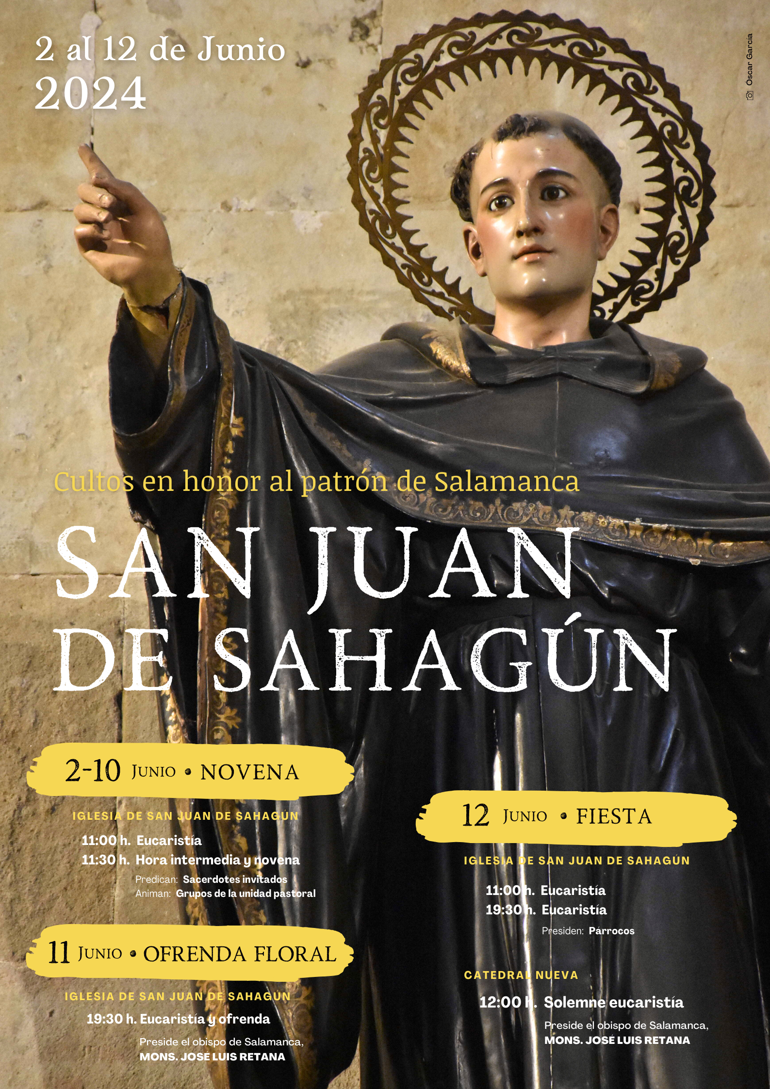 El martes, 11 de junio, víspera de la fiesta, tendrá lugar la tradicional ofrenda floral al patrono, que realiza el Ayuntamiento de Salamanca, en el marco de una eucaristía a las 19:30 horas en la parroquia de San Juan de Sahagún.
