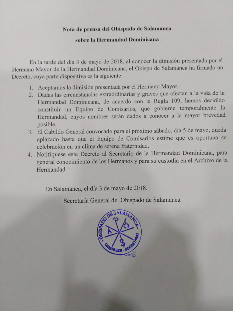 En la tarde del día 3 de mayo de 2018, al conocer la dimisión presentada por el Hermano Mayor de la Hermandad Dominicana, el Obispo de Salamanca ha firmado un Decreto, cuya parte dispositiva es la siguiente: