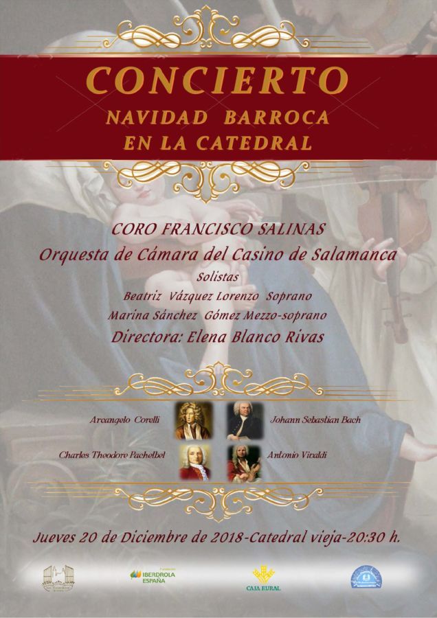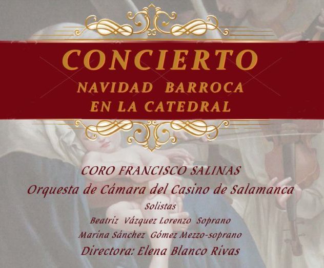 Con motivo de las fiestas navideñas, el próximo jueves 20 de diciembre a las 20:30 h, tendrá lugar en la Catedral Vieja un concierto ofrecido por el Coro Francisco Salinas y la Orquesta de Cámara del Casino de Salamanca bajo la dirección de Elena Blanco Rivas. El programa recoge obras de algunos de los más célebres maestros del Barroco como Vivaldi, Corelli, Bach o Pachelbel.