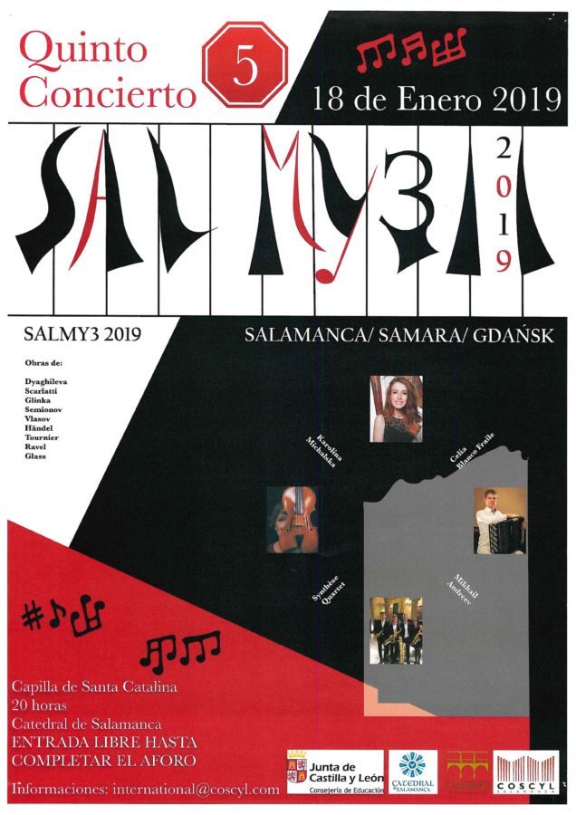 El próximo viernes 18 de enero, a las 20.00 horas, tendrá lugar en a Capilla de Santa Catalina de la Catedral Vieja un concierto ofrecido por los alumnos y profesores del Festival Internacional SALMY3 2019 que se celebra en Salamanca del 14 al 19 de este mes organizado por el Conservatorio Superior de Música de Castilla y León. El aforo de la sala es de 200 plazas, que se ocuparán por riguroso orden de llegada de los asistentes. La entrada se efectuará por la “Puerta de los Carros” situada en la Calle Tentenecio.
