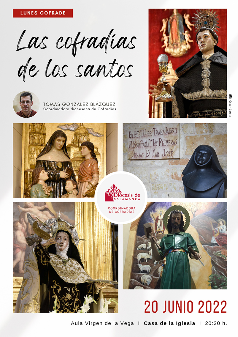 El próximo lunes, 20 de junio, se va a celebrar el último encuentro de este curso que estará dedicado a “Las cofradías de los santos” y que será expuesto por Tomás González Blázquez, miembro del equipo apostólico de la Coordinadora diocesana de Cofradías, y que contará con representantes de este tipo de hermandades. Como viene siendo habitual, el acto tendrá lugar en el aula Virgen de la Vega de la Casa de la Iglesia, a las 20:30 horas.