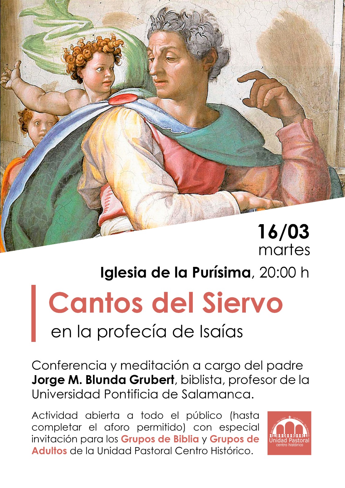 Jorge M. Blunda Grubert, biblista y profesor de la Universidad Pontificia de Salamanca, ofrecerá el martes, 16 de marzo, a las 20.00 horas en la iglesia de La Purísima, una conferencia-meditación que lleva por lema: “Cantos del Siervo en la profecía de Isaías”. La entrada es libre hasta completar el aforo permitido.