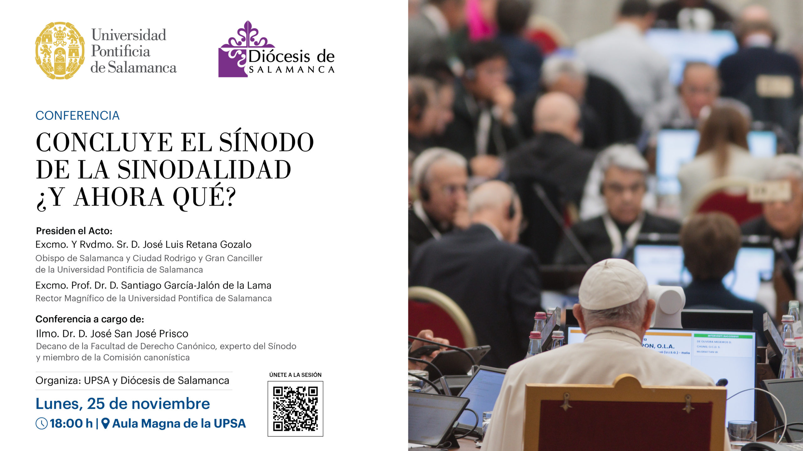 La Universidad Pontificia de Salamanca (UPSA), en colaboración con la Diócesis de Salamanca, organiza la conferencia: “Concluye el Sínodo de la sinodalidad. ¿Y ahora qué?“, que impartirá el próximo lunes, 25 de noviembre, el sacerdote operario y decano de la Facultad de Derecho Canónico, José San José Prisco, quien participó en el Sínodo como experto de la Comisión de Derecho Canónico. El acto, que tendrá lugar en el aula Magna de la UPSA a las 18:00 horas, contará con la presencia del obispo de Salamanca y Gran Canciller de la Universidad Pontificia, Mons. José Luis Retana, y el rector, Santiago García-Jalón de la Lama, y puede seguirse online a través de este enlace.
