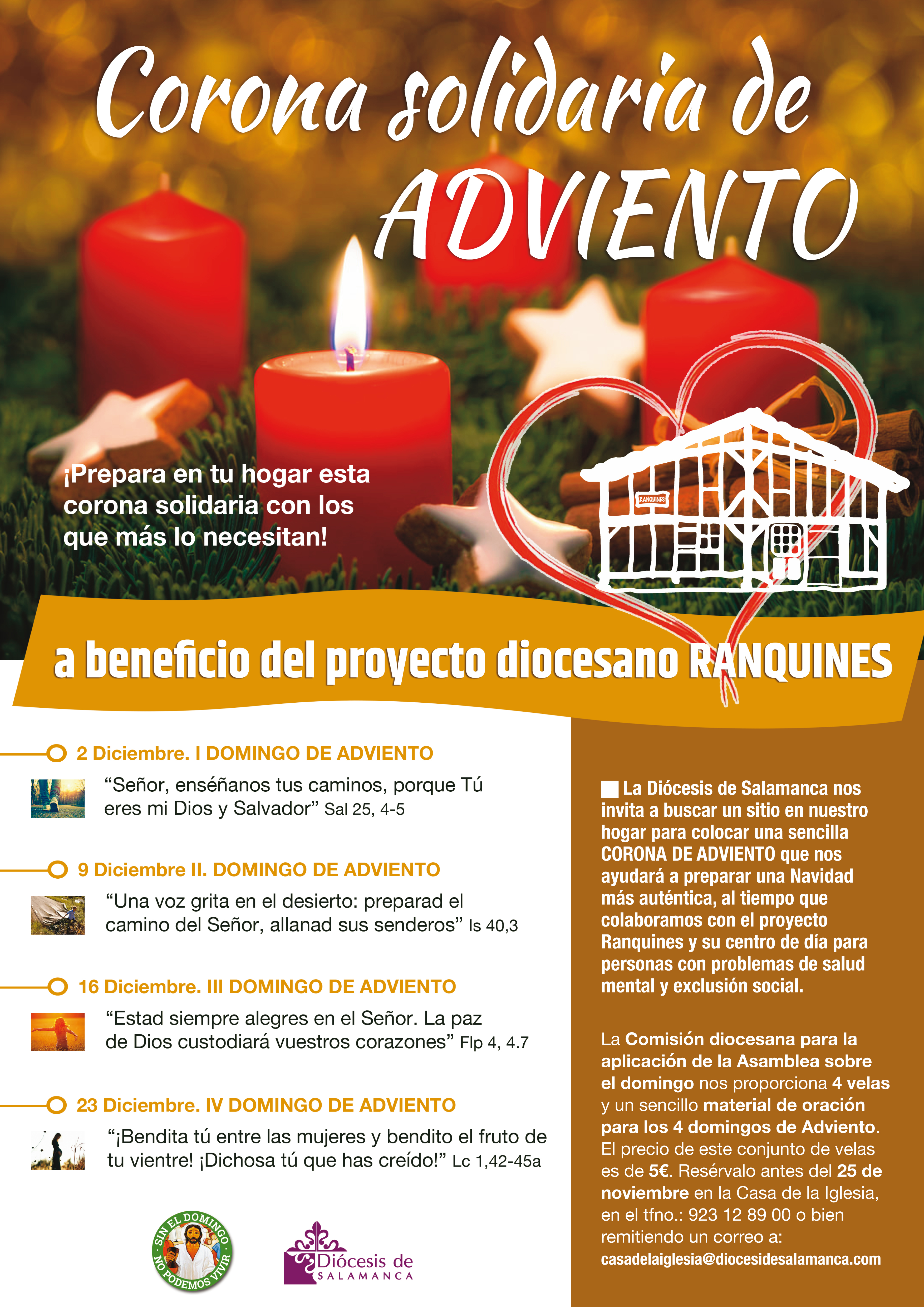 No podemos vivir sin el domingo. No debemos perder la oportunidad de que los cuatro primeros domingos del año litúrgico, los cuatro domingos de Adviento, nos ayuden a vivir una Navidad más auténtica. No queremos que en ningún hogar salmantino falte este año la corona de Adviento, una corona solidaria con los que más lo necesitan y en comunión con muchas familias de nuestra diócesis.