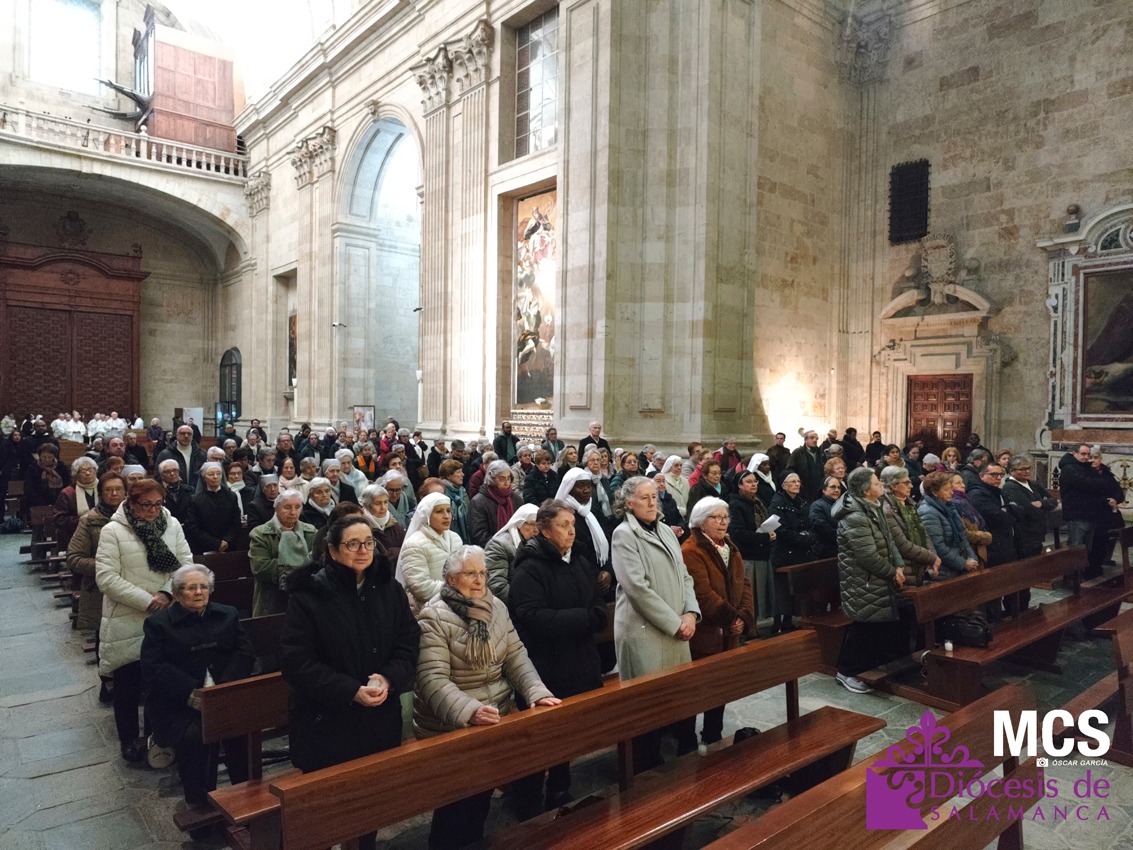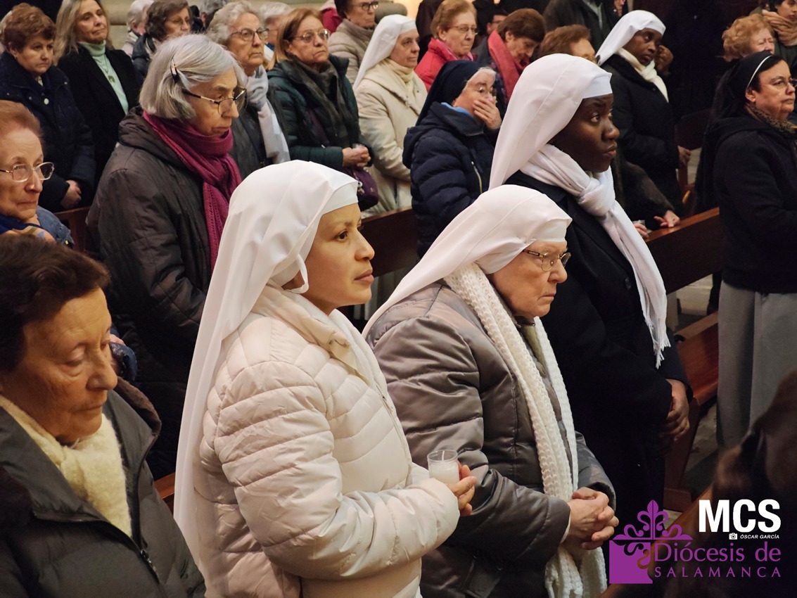 En su mensaje, el pastor de la Diócesis de Salamanca destacó los desafíos de la vida consagrada en la actualidad, como la disminución de vocaciones y el envejecimiento de las comunidades, los problemas económicos y sociales, como la globalización, el relativismo y la irrelevancia social. Unas dificultades, que como reconoció “no son exclusivas de la vida consagrada”, y es donde «se levanta nuestra esperanza, fruto de la fe en el Señor». Por ello, animó a los consagrados a “no ceder a las tentaciones de la cantidad o la eficiencia”, sino a mantenerse firmes en la esperanza que se fundamenta en Dios.