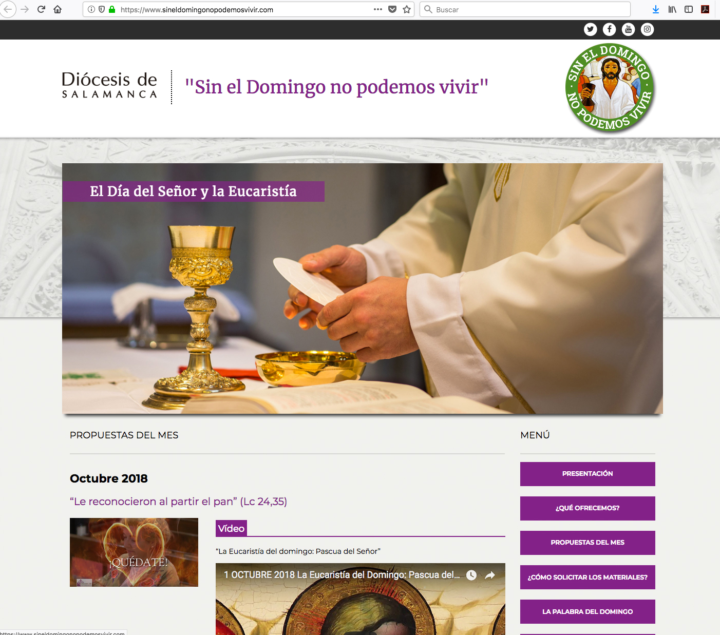 La Comisión diocesana para la Aplicación de la Asamblea sobre el Domingo acaba de lanzar la web: http://www.sineldomingonopodemosvivir.com en la que se van a recoger las propuestas, mes a mes, de una iniciativa diocesana para revitalizar la Eucaristía dominical y el Día del Señor.