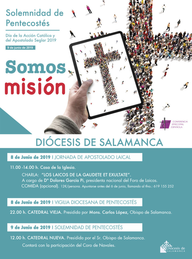 El domingo 9 de junio, solemnidad de Pentecostés, se celebra el Día de la Acción Católica y del Apostolado Seglar con el lema, “Somos misión“. La Comisión Episcopal de Apostolado Seglar (CEAS) es la encargada de elaborar los materiales para divulgar y preparar la jornada.