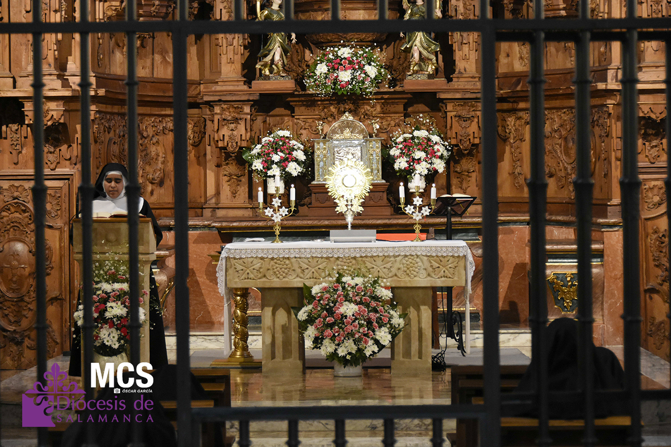 Ubicado en la céntrica Ronda del Corpus de Salamanca se alza el Monasterio del Corpus Christi de las hermanas Pobres de Santa Clara, también conocidas como Clarisas. Su iglesia, con la puerta siempre abierta y un cartel que invita a entrar: “Jesús te espera”, atrae a diario a decenas de personas en busca de un respiro del ajetreo cotidiano y un lugar donde escuchar a Dios y encontrar la paz. Este pequeño oasis es una de las más de 70 capillas de Adoración Eucarística Perpetua en España, abiertas las 24 horas los 365 días del año, permitiendo que los fieles se acerquen al Señor en cualquier momento. Este servicio es posible en Salamanca gracias a la colaboración de unos 250 adoradores que, más allá de la misa, se organizan en turnos para acompañar y velar a Jesús Sacramento.