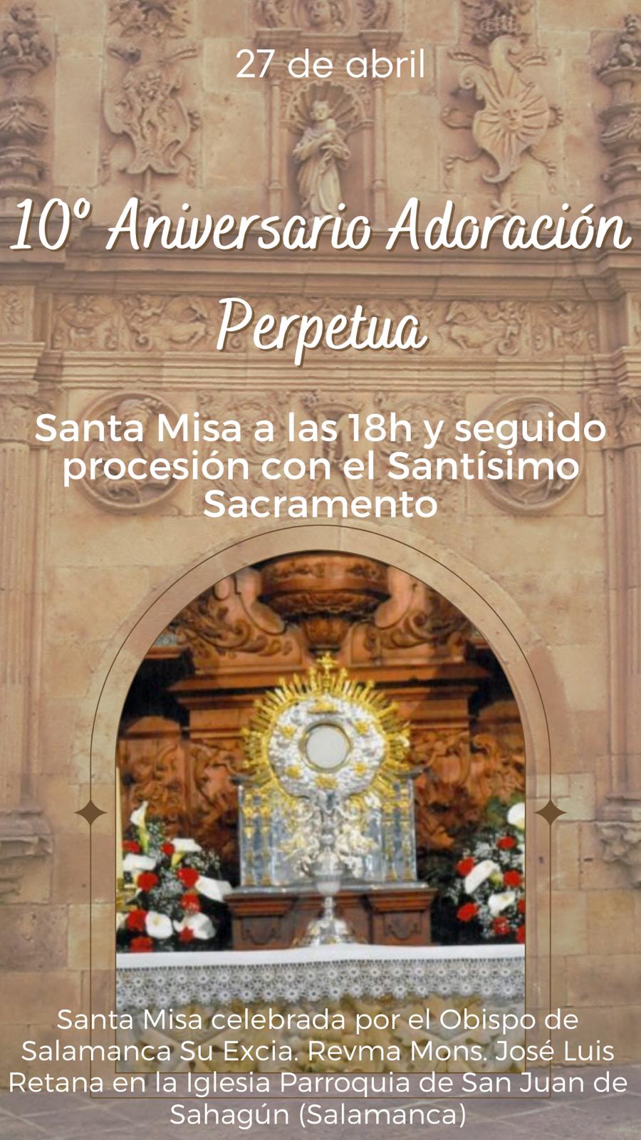 El sábado, 27 de abril, coincidiendo con la fecha de su inauguración en 2014, se celebrará una eucaristía de acción de gracias por estos diez años a las 18:00 horas en la iglesia de San Juan de Sahagún que será presidida por el obispo Mons. José Luis Retana. Después, entre cantos eucarísticos y bajo palio, se trasladará el Santísimo Sacramento en procesión por las calles del centro de la ciudad hasta la Capilla de la Adoración Eucarística Perpetua. Allí será entronizado de nuevo y continuarán los turnos de adoración.