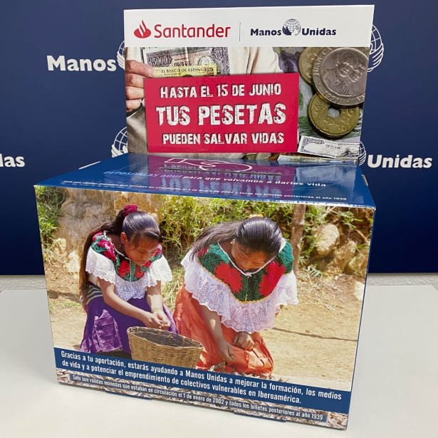 Manos Unidas ha relanzado su campaña: “Tus pesetas pueden salvar vidas”, a la que se ha unido el Banco Santander, y que tiene entre sus objetivos recoger las pesetas que aún quedan en circulación para cambiarlas por euros y destinar la recaudación a alguno de los proyectos solidarios que cada año apoya la ONG de la Iglesia Católica.