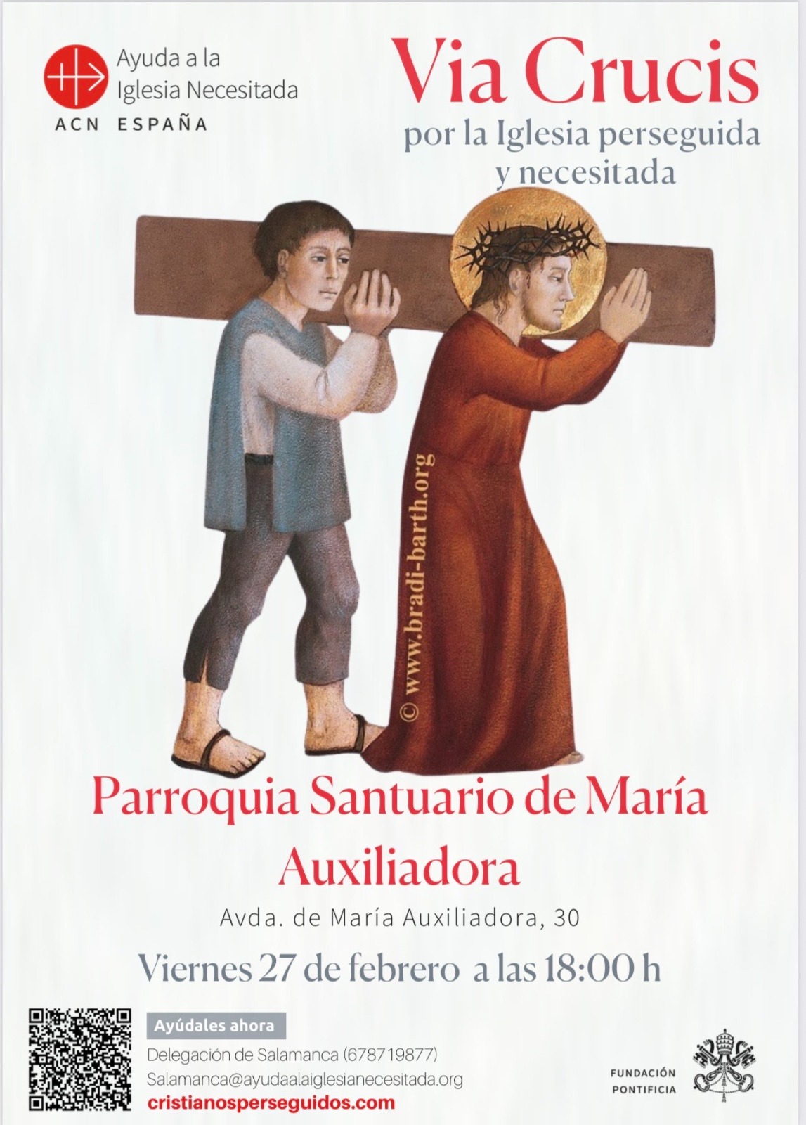 La delegación salmantina de Ayuda a la Iglesia Necesitada organiza dos celebraciones del Vía Crucis por la Iglesia perseguida y necesitada, en el marco de la Cuaresma. Las convocatorias tendrán lugar el viernes, 27 de febrero, en la iglesia de San Juan de Sahagún, al finalizar la eucaristía de las 11:00 horas, y en la parroquia santuario de María Auxiliadora, a las 18:00horas.