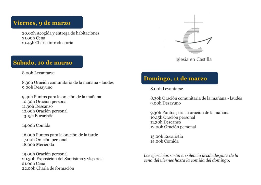 Un fin de semana de intimidad con el Señor en este tiempo de Cuaresma para “reformar la vida”, para nuestra conversión. Los Ejercicios serán en silencio, en régimen de internado, y el ejercitante tendrá la posibilidad de ser acompañado, para ello estarán a disposición distintos delegados diocesanos de catequesis.