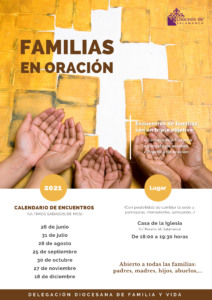 Además de rezar en familia, se invita a orar por y con las familias porque, “es una necesidad que sentimos como Iglesia”. Por ese motivo, cada último sábado de cada mes, se celebra un encuentro familiar, a las 18:00 horas en la Casa de la Iglesia de Salamanca (C/ Rosario, 18), planteado como escuela de oración en el que se ofrecen orientaciones para la práctica de la oración, a través de los salmos, el oficio de las horas, la Palabra de Dios,… Los participantes comparten sus inquietudes y rezan juntos.