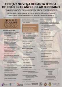 En otra de las sedes jubilares de este Año Santo dedicado a Santa Teresa, la iglesia de Santa María Magdalena de los padres Carmelitas Descalzos de Salamanca capital, clausuran el Año Jubilar con una eucaristía este domingo, 15 de octubre, a las 13:00 horas. Además, celebrarán un triduo de Santa Teresa que comienza este viernes, 13 de octubre, con una conferencia titulada “Así era Teresa”, a cargo de P. Paco M. Tejedor, OCD. Las eucaristías del triduo se celebrarán a las 20:00, con varias misas en el templo cada día.