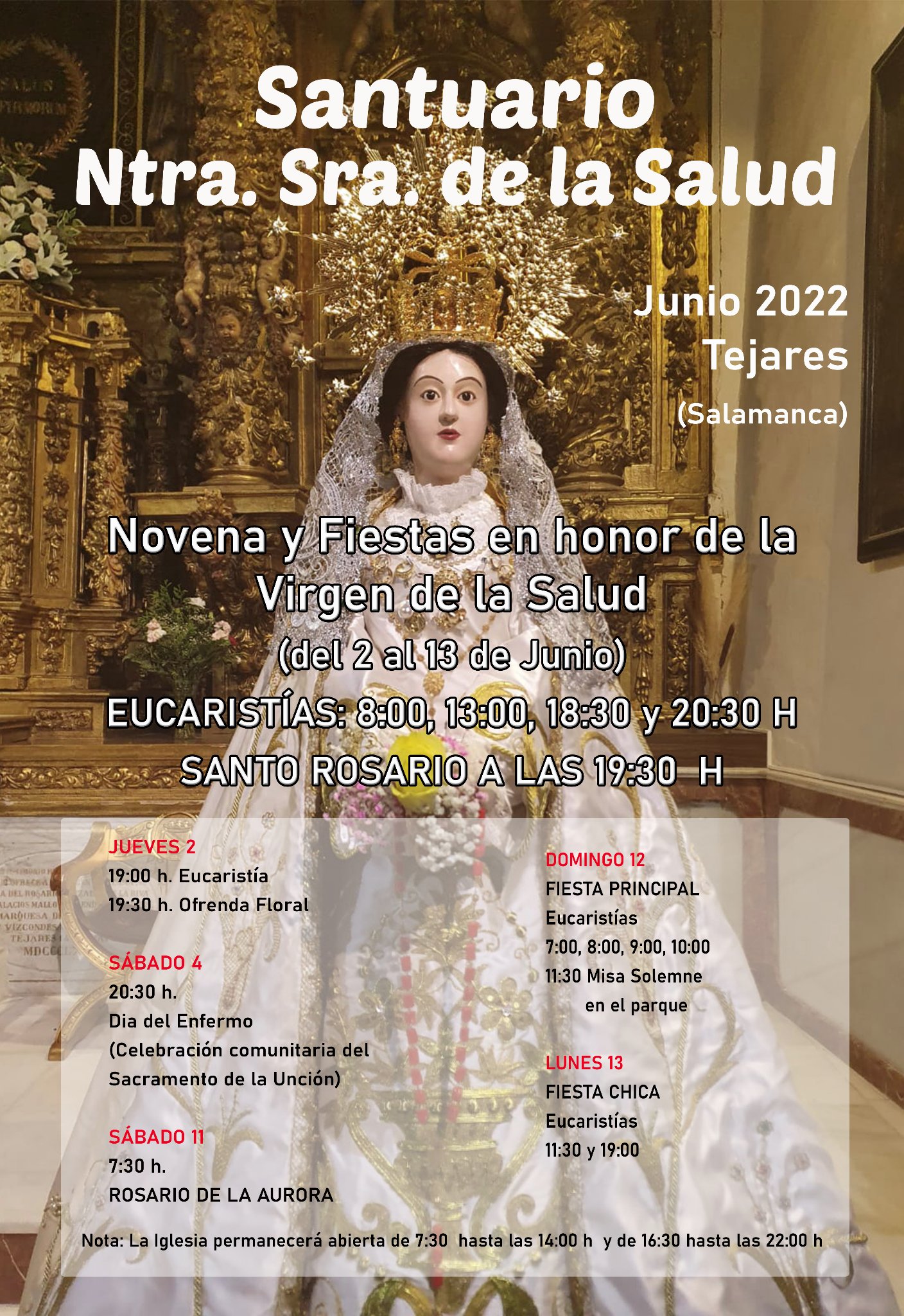 El domingo, 12 de junio, se celebrará la fiesta principal de Nuestra Señora de La Salud, con eucaristías a las 7:00, 8:00, 9:00 y 10:00 de la mañana. Y de nuevo los fieles acompañarán a la Virgen en la misa solemne que volverá a celebrarse al aire libre, en el parque la La Salud, a las 11.30 horas, seguida de procesión.