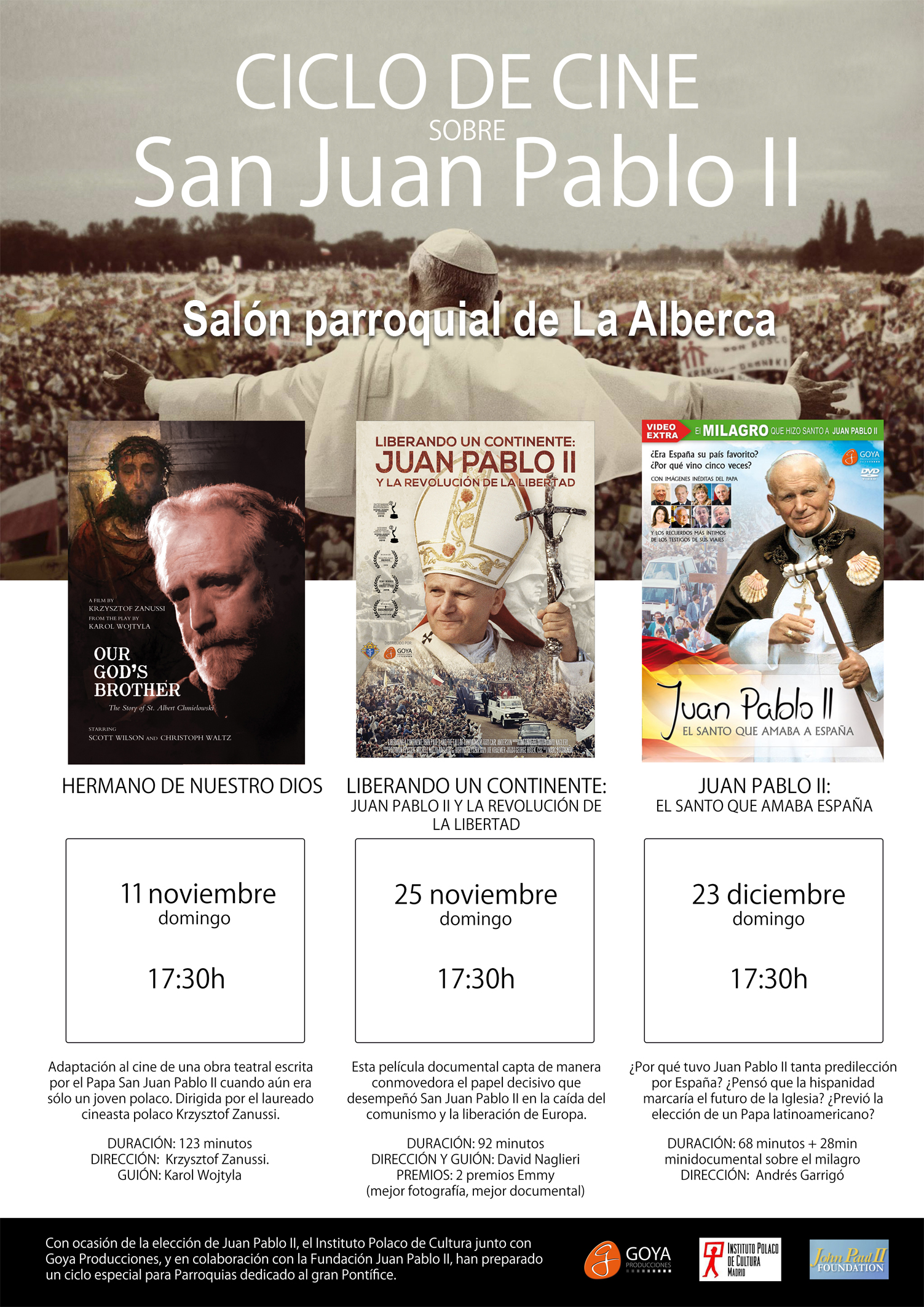 Este año se conmemora el 40º aniversario de la elección del papa Juan Pablo II con este motivo el Instituto Polaco de Cultura junto con Goya Producciones, y la Fundación Juan Pablo II, han preparado un ciclo de cine para parroquias dedicado al gran Pontífice. El ciclo consta de tres películas: “Hermano de nuestro Dios”, “Liberando un continente” y “El Santo que amaba España”.