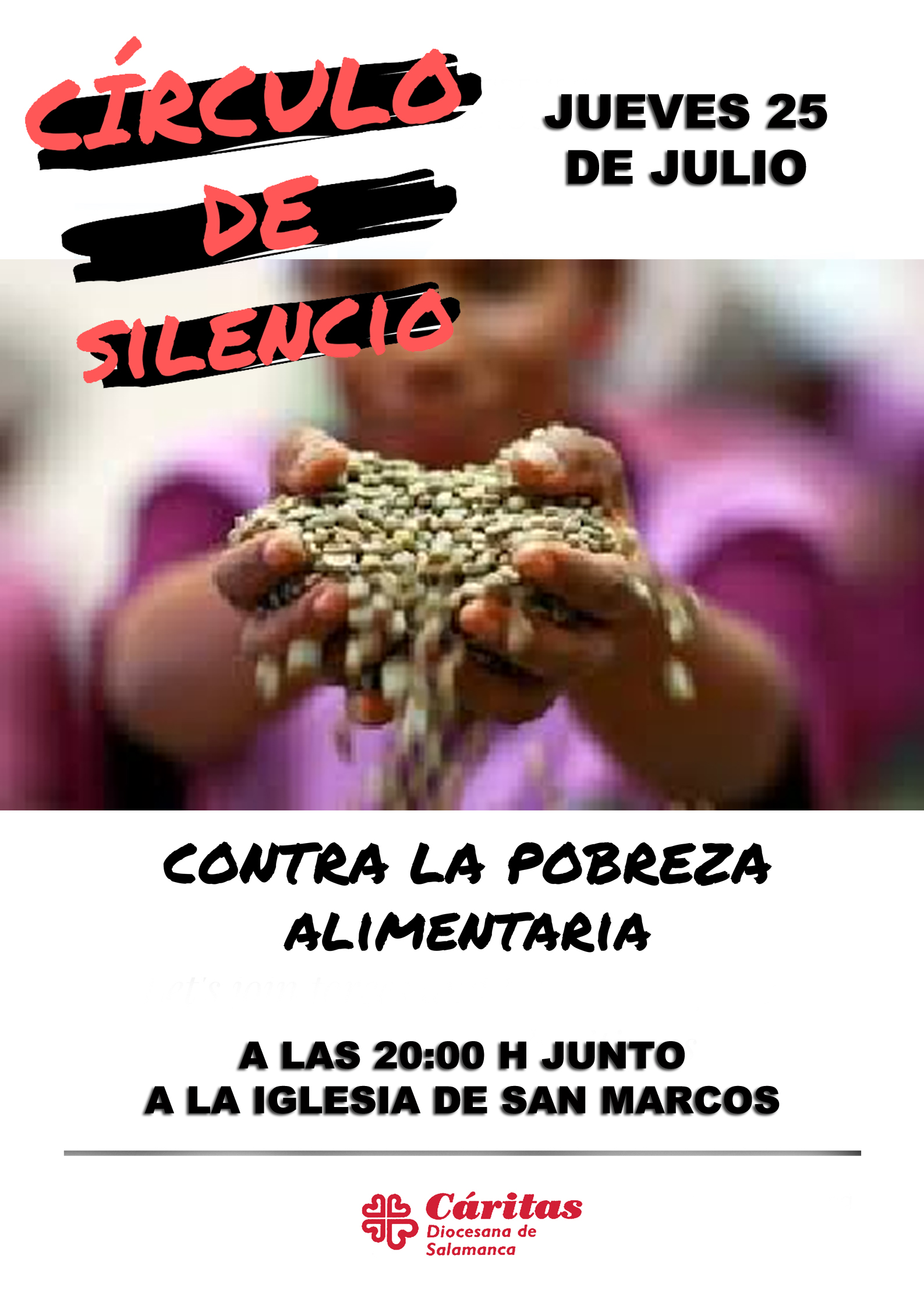 Como cada último jueves de mes, Cáritas Diocesana de Salamanca convoca este jueves, 25 de julio, a las 20:00 horas en la Puerta de Zamora a la movilización silenciosa a favor de los derechos de todos. En esta ocasión, el círculo de silencio será en torno a la pobreza alimentaria y se celebrará al mismo tiempo en Cáceres y en Beja (Portugal).