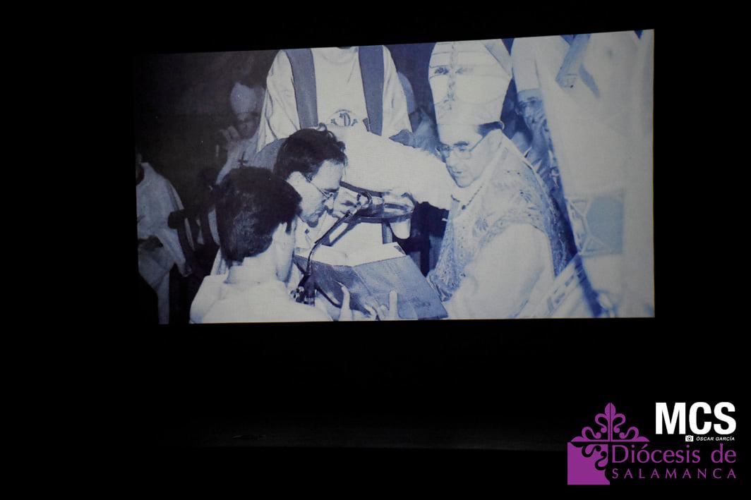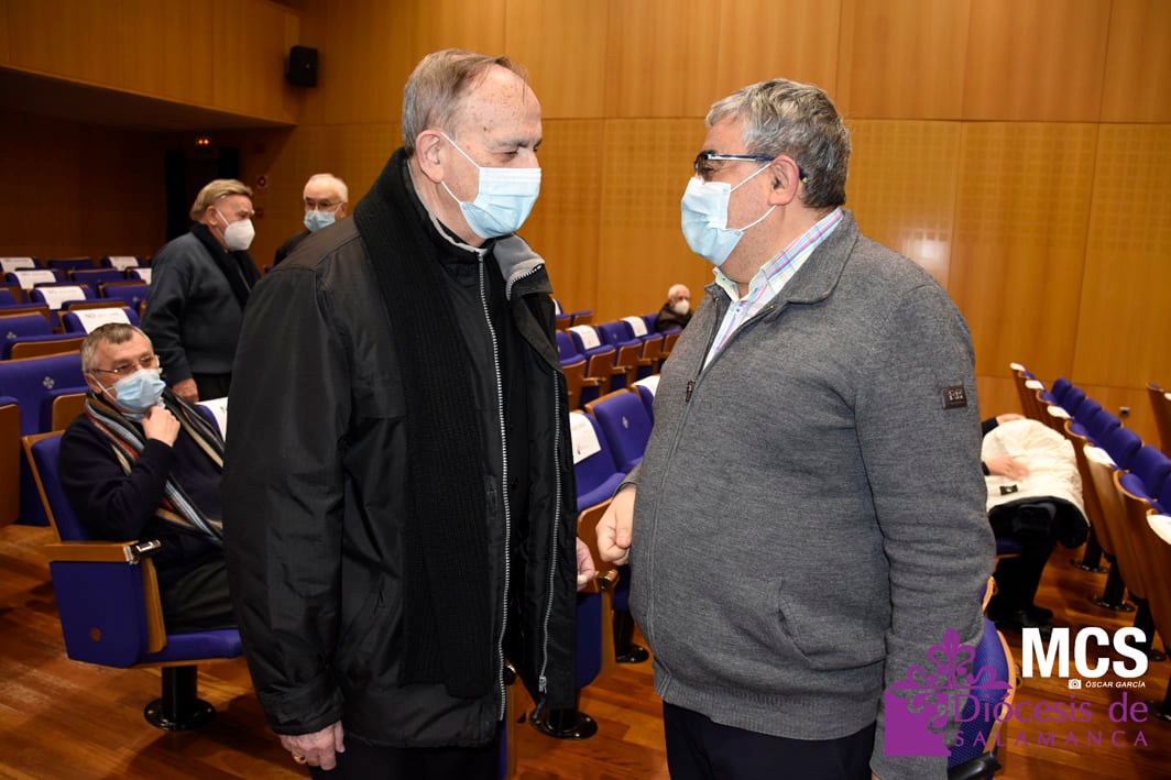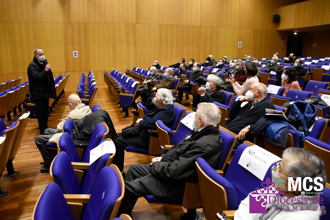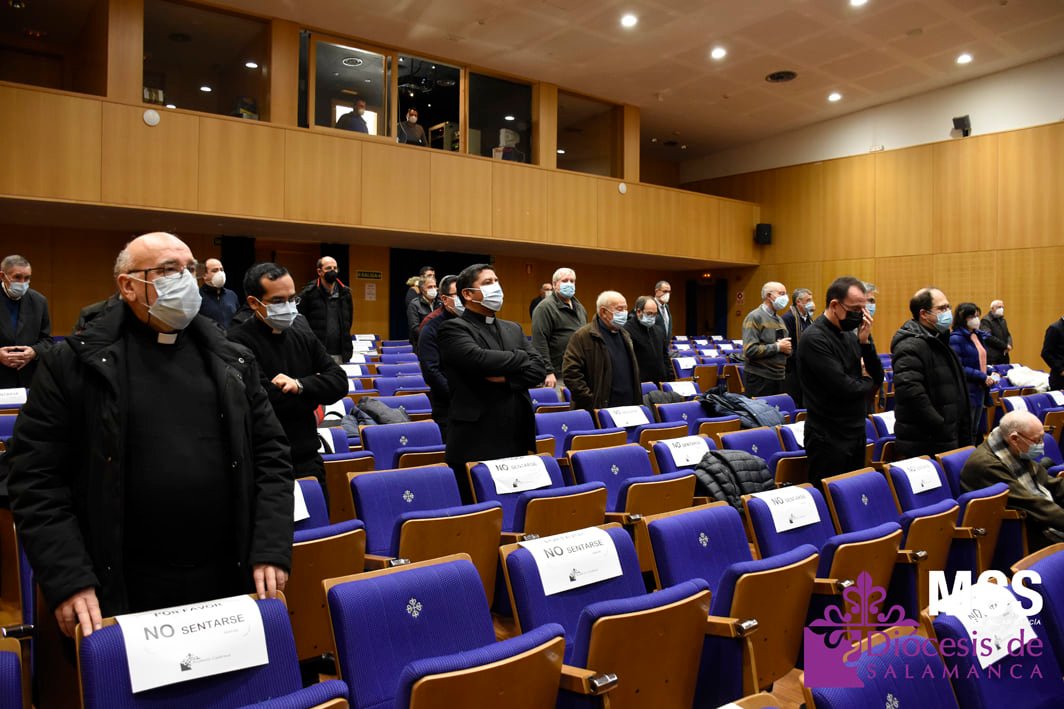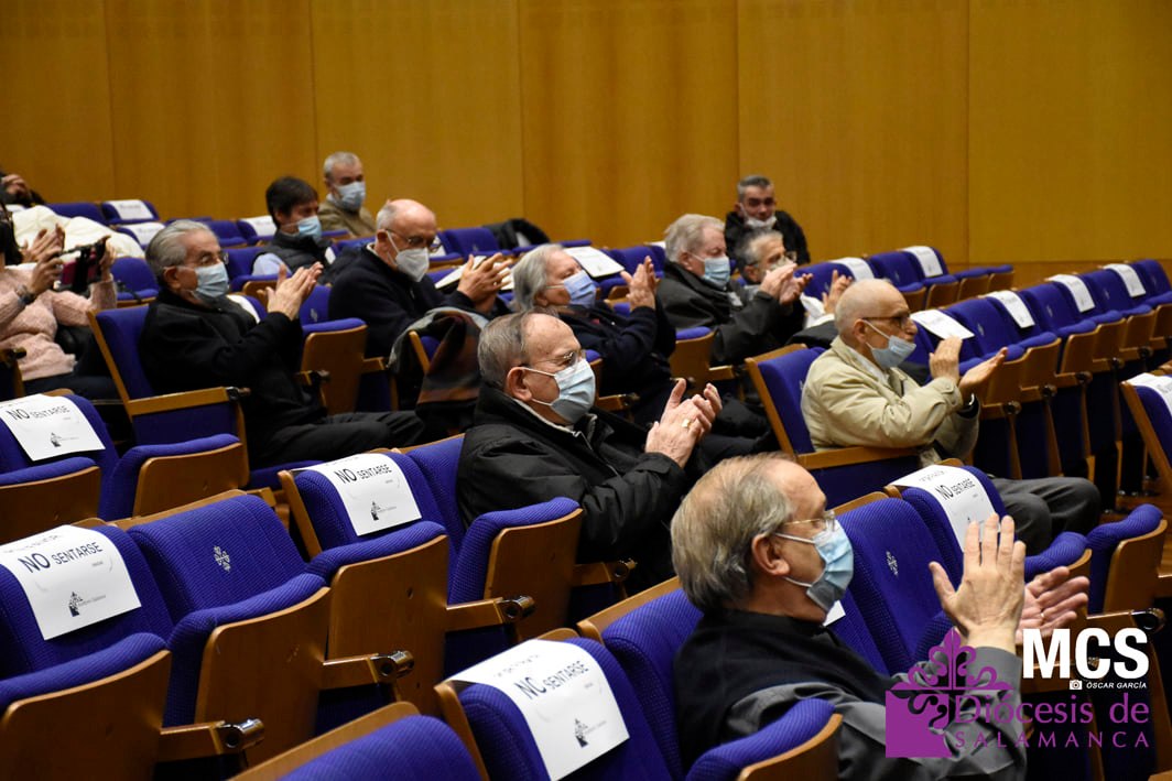 Un largo aplauso fue reflejo del agradecimiento del clero diocesano al que ha sido su pastor durante los últimos 18 años. En el auditorio de Calatrava se proyectó un sencillo documental donde se repasa la vida y la trayectoria del obispo y actual administrador apostólico, Mons. Carlos López, desde su localidad natal, en Papatrigo, sus años de formación, sus primeros destinos pastorales, o su llegada a Salamanca, en 2003, entre otros aspectos.