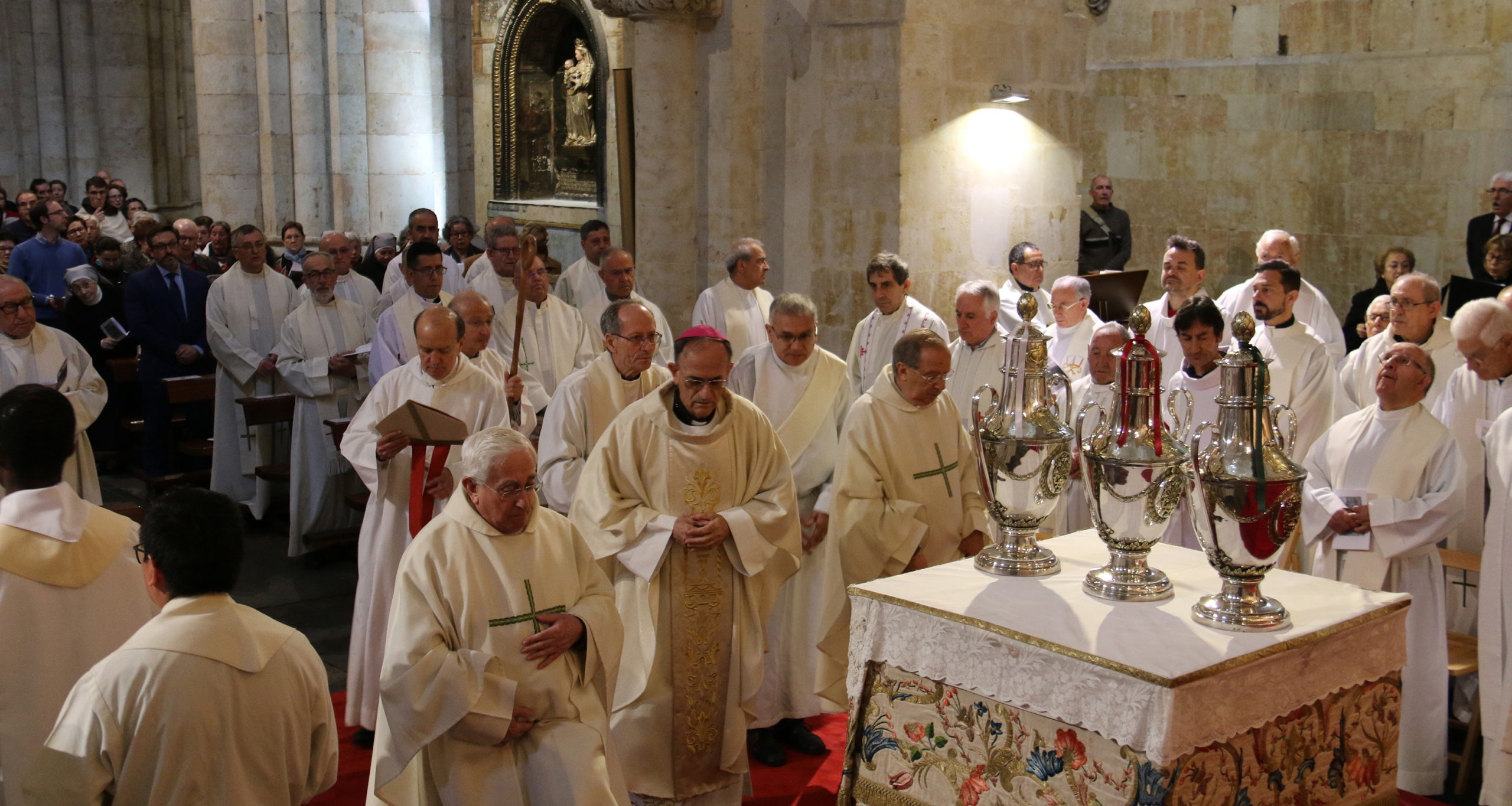 Durante la Semana Santa se celebra en la Catedral una de las liturgias propias de la seo, la misa Crismal, una eucaristía que preside el obispo de la Diócesis de Salamanca, Carlos López Hernández, en su sede, y en la que se congregan los sacerdotes, diáconos, religiosos y el Pueblo de Dios.
