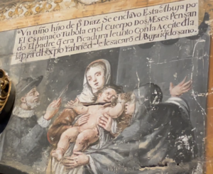 Entre otros milagros que realizó el Cristo de las Batallas y que se representan en el muro de al Catedral, destacan los niños que se caen a un pozo o al río, “y sus padres se encomiendan al Cristo y los pueden recuperar”, o gente que está tullida, “y al untarse en la pierna o el brazo el aceite de la lámpara del altar del Cristo, quedan sanos”.