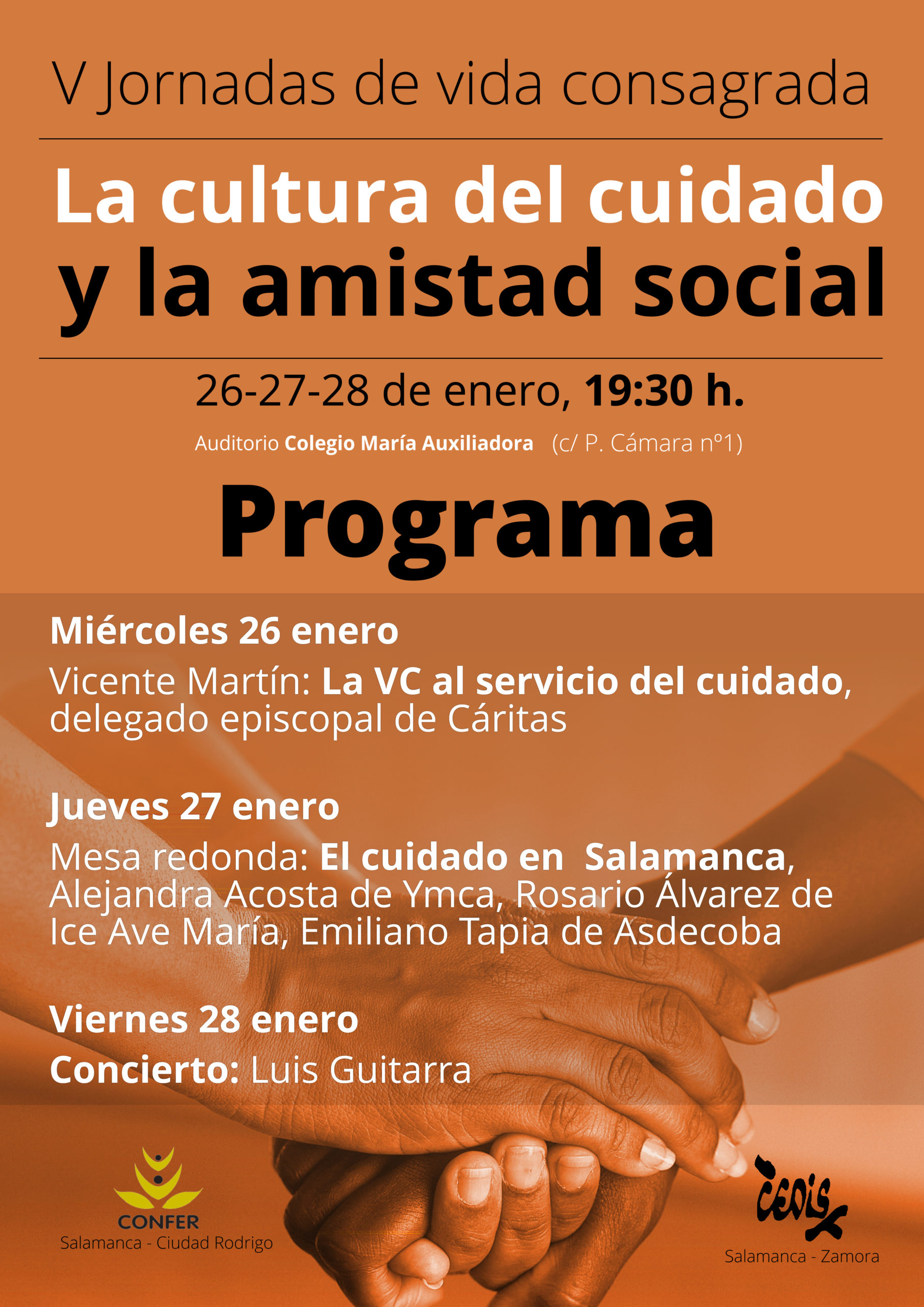 “La cultura del cuidado y la amistad social”, es el lema de la quinta edición de las Jornadas de Vida Consagrada, que organizan conjuntamente CONFER Salamanca-Ciudad Rodrigo y CEDIS Salamanca-Zamora, y que se van a celebrar del 26 al 28 de enero, a las 19:30 horas, en el auditorio del colegio María Auxiliadora, en la calle Padre Cámara de Salamanca.