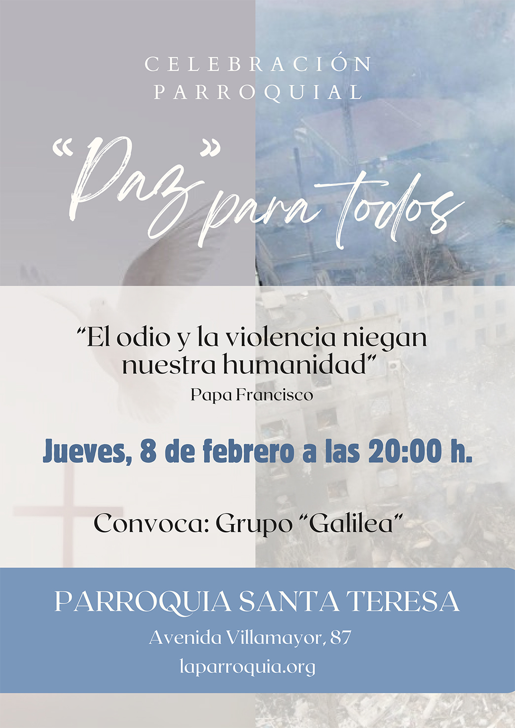 El grupo “Galilea” de la parroquia Santa Teresa en Salamanca responde al llamamiento del papa Francisco convocando una eucaristía por la paz. Bajo el lema: “Paz para todos”, se invita a la comunidad diocesana a reunirse el jueves, 8 de febrero, a las 20:00 horas en la iglesia en este encuentro de oración y celebrar “la reconciliación y el perdón frente a las guerras, el terrorismo y la violencia que se siguen produciendo en diferentes países y que nos afectan”, incluso cuando no los sufrimos “en primera línea”, como indica el sacerdote redentorista, P. Octavio Hildalgo.