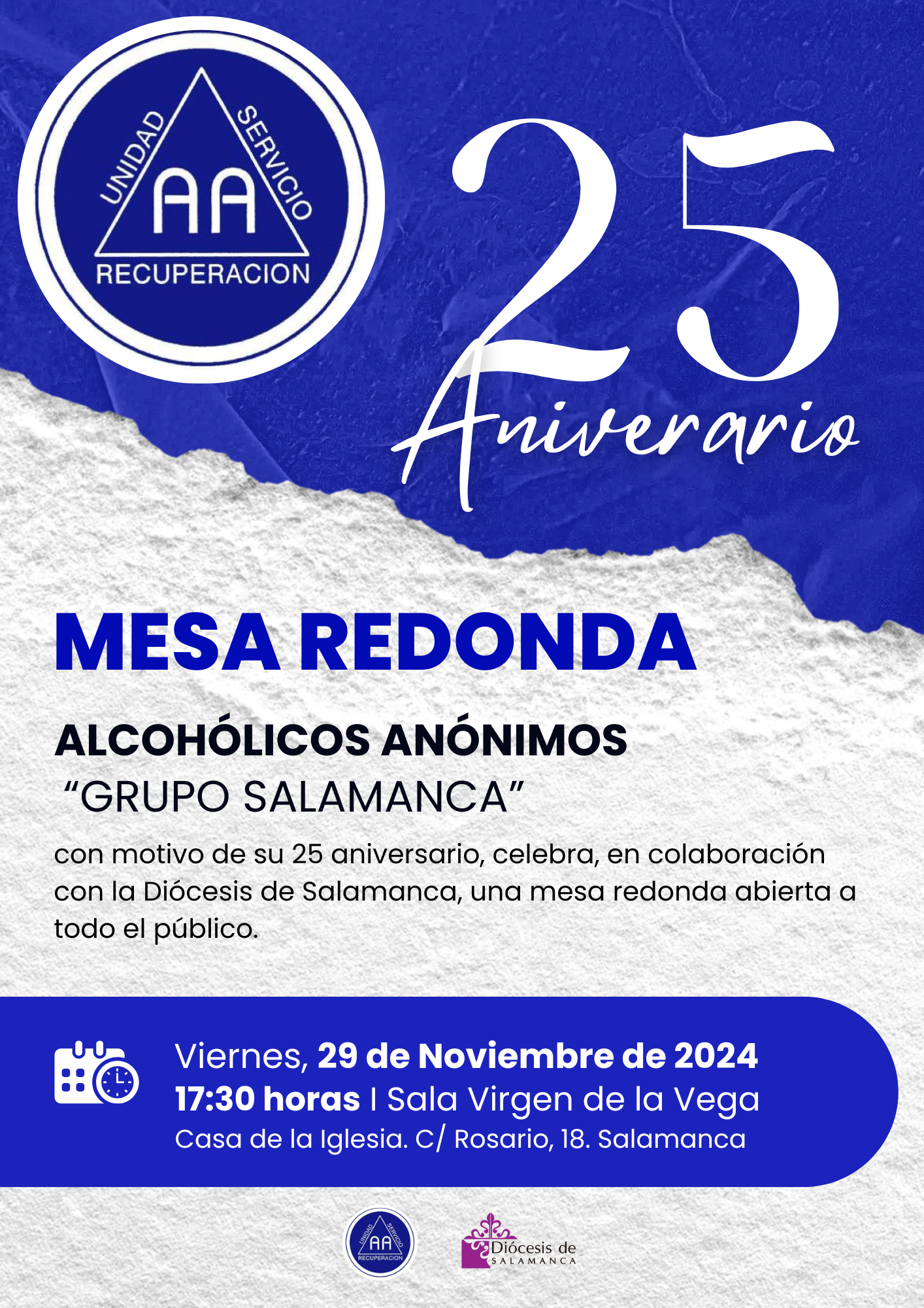 El Grupo Salamanca de Alcohólicos Anónimos (AA) celebra su 25 aniversario este viernes, 29 de noviembre, con una mesa redonda abierta al público organizada en colaboración con la Diócesis de Salamanca, y que tiene como fin visibilidad la labor de esta comunidad de hombres y mujeres, que se dedica a ofrecer apoyo y esperanza a quienes luchan cada día para superar la adicción al alcohol. El acto, que tendrá lugar a las 17:30 horas en la sala Virgen Vega de la Casa de la Iglesia (C/ Rosario, 18), será moderado por el decano de Psicología de la Universidad Pontificia de Salamanca, Alfonso Salgado, y contará con la participación del obispo de Salamanca, Mons. José Luis Retana, la delegada episcopal para una Iglesia samaritana y de la caridad, Mercedes Bayo ss.cc, así como profesionales de la salud, autoridades locales y provinciales.