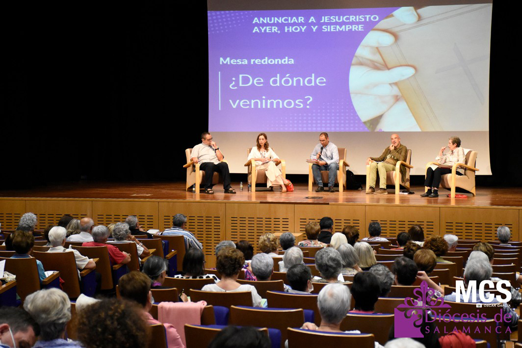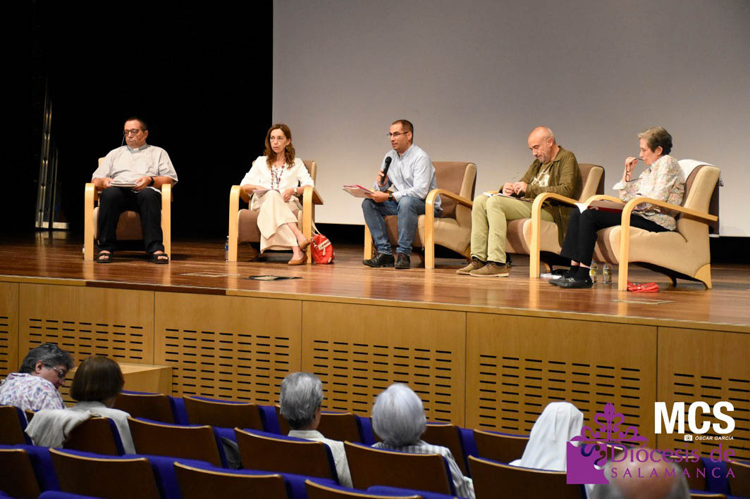 La sesión del miércoles en el auditorio tenía formato de mesa redonda, donde participaron cuatro ponentes moderados por el periodista y conductor de El Espejo e Iglesia Noticia, Miguel Navarro. En ella se centraron en una idea: “Ayer, ¿de dónde venimos”, en el que repasaron varios procesos sinodales y el compromiso social de Salamanca. El primero en intervenir fue el sacerdote diocesano, Joaquín Tapia, que fue el director del Sínodo celebrado en la diócesis entre 1985 y 1989, y vicario general con Mons. Braulio Rodríguez, quién contextualizó el momento de celebración de aquel Sínodo, veinte años después del Concilio del Vaticano II, y los documentos finales del mismo, tras una proceso de algo más de cuatro años que se clausuró con una misa multitudinaria en el estadio Helmántico.