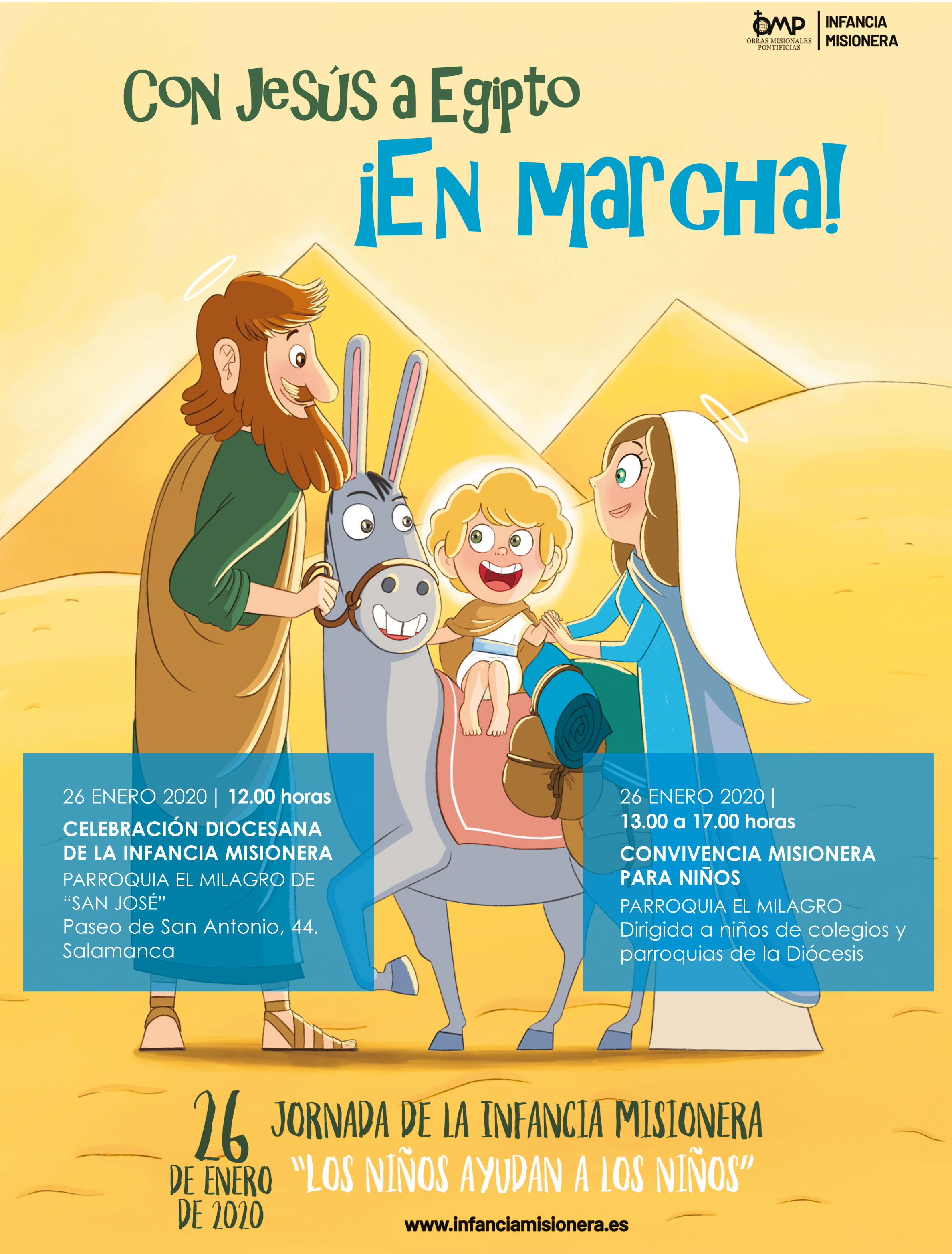 El próximo domingo 26 de enero y bajo el lema “Con Jesús a Egipto ¡En marcha!”, la Iglesia española celebra la Jornada de la Infancia Misionera, un día para tomar conciencia y promover entre los niños acciones que les ayuden a colaborar activamente en la cooperación con la infancia necesitada en cualquier rincón del mundo. En Salamanca, el Servicio diocesano de Misión ad gentes invita a los niños a participar en una jornada misionera que dará comienzo a las 12.00 horas en la parroquia El Milagro de San José con la celebración de la eucaristía y una convivencia en los locales parroquiales, hasta las 17.00 horas, en la que se proyectará un vídeo y se llevarán a cabo diferentes talleres sobre cada uno de los continentes.
