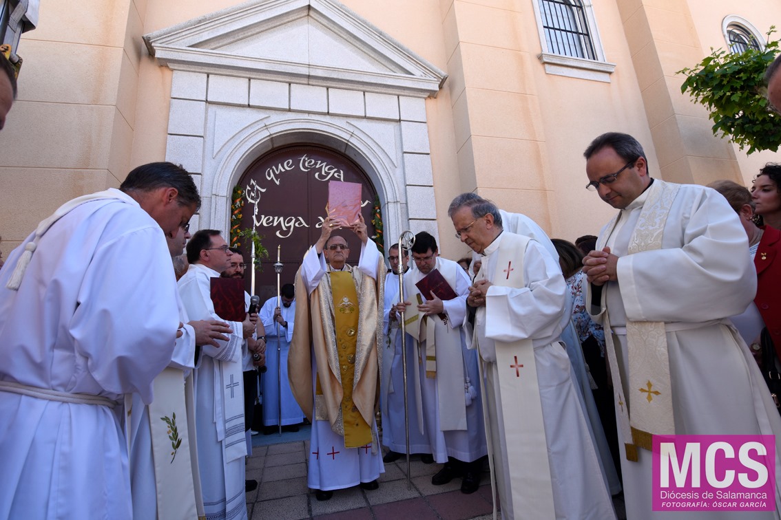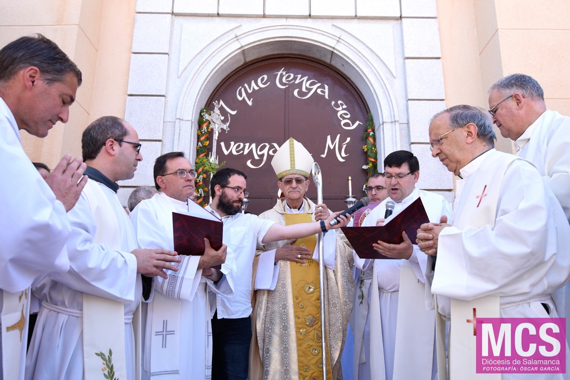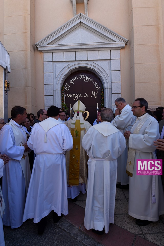 La celebración de apertura tuvo lugar en la iglesia del Monasterio de las Clarisas de Cantalapiedra. Antes de iniciarse la misa votiva en el templo, (así denominada por estar ofrecida por una intención especial), en este caso, al Sagrado Corazón de Jesús, se celebró el rito de apertura de la Puerta Santa, en la que el obispo de la Diócesis de Salamanca, Carlos López, recordó las palabras del salmo 118: “Abridme las puertas de la justicia; Entraré por ellas…”. Después, la puerta se abrió y entró en primer lugar portando el Evangeliario, que lo mostró al pueblo. Entre los ritos de la apertura del Año Jubilar estuvo también la memoria del Bautismo, con la bendición y aspersión con agua bendita, antes del inicio de la eucaristía, o la lectura de los decretos y la bendición del Papa para todos los asistentes.
