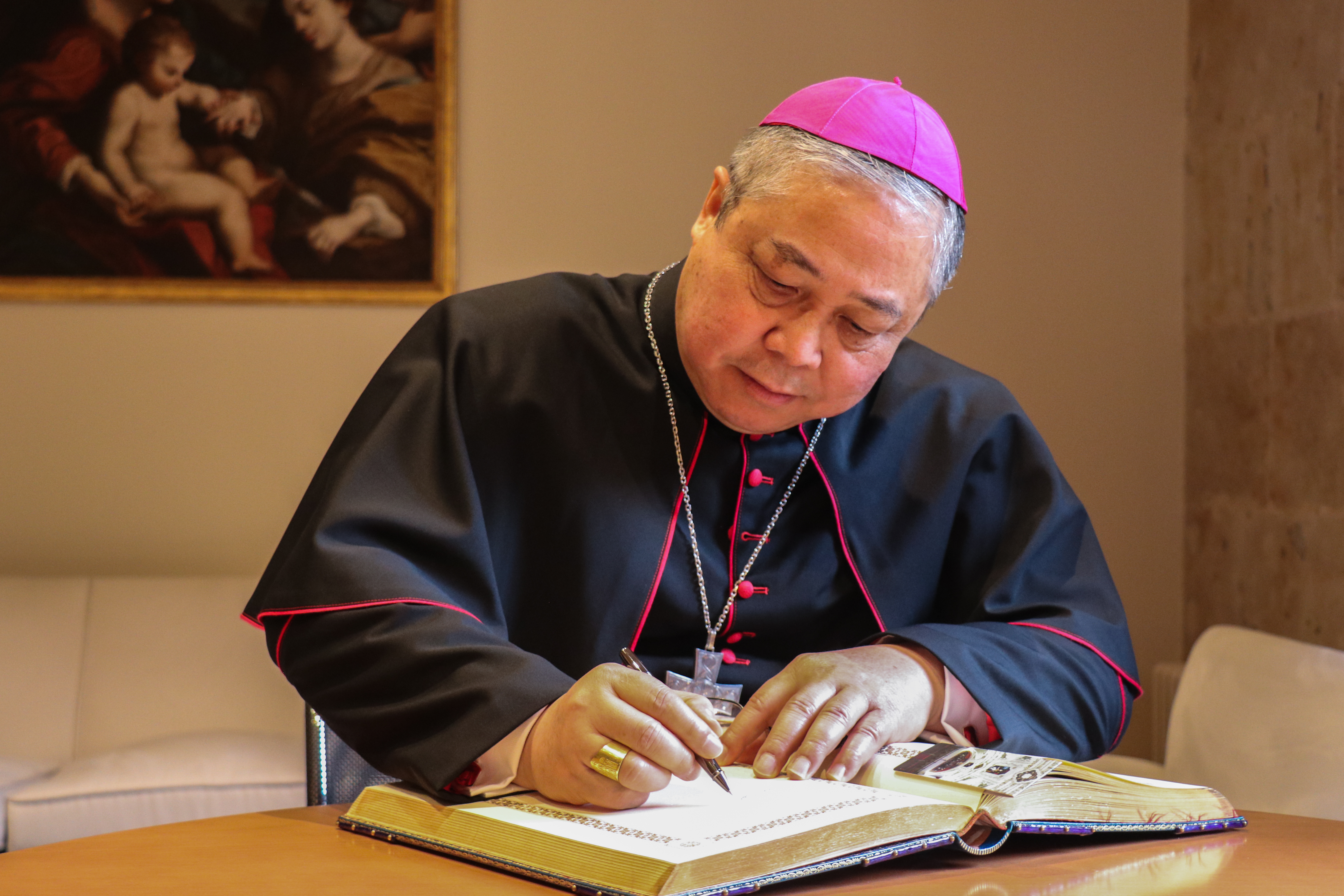 Otro momento singular fue “cuando trató de ver la cúpula de la Catedral Nueva a través del espejo. Y durante la firma en el Libro de Honor de la Catedral”, señala que el Nuncio, “se quedó concentrado y con pulso firme”, donde escribió: “¡Que Dios sea siempre con nosotros!”, junto con su rúbrica: “Bernardito Auza, Nuncio apostólico en España, el 12 de febrero de 2020”. Por último, el deán manifiesta que también le vio “muy gozoso” en el presbiterio de la Catedral Vieja, contemplando el retablo y la imagen de la Virgen.