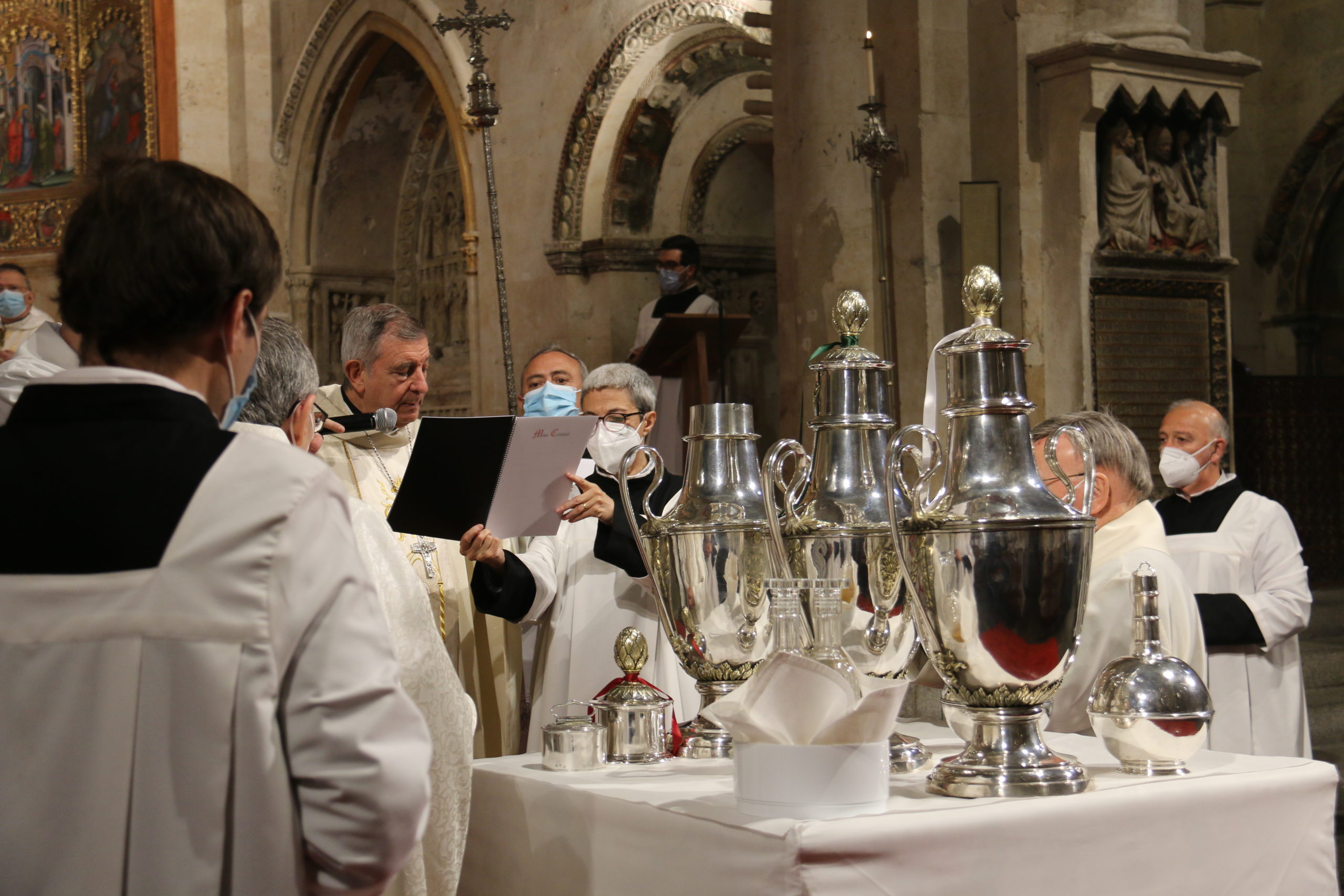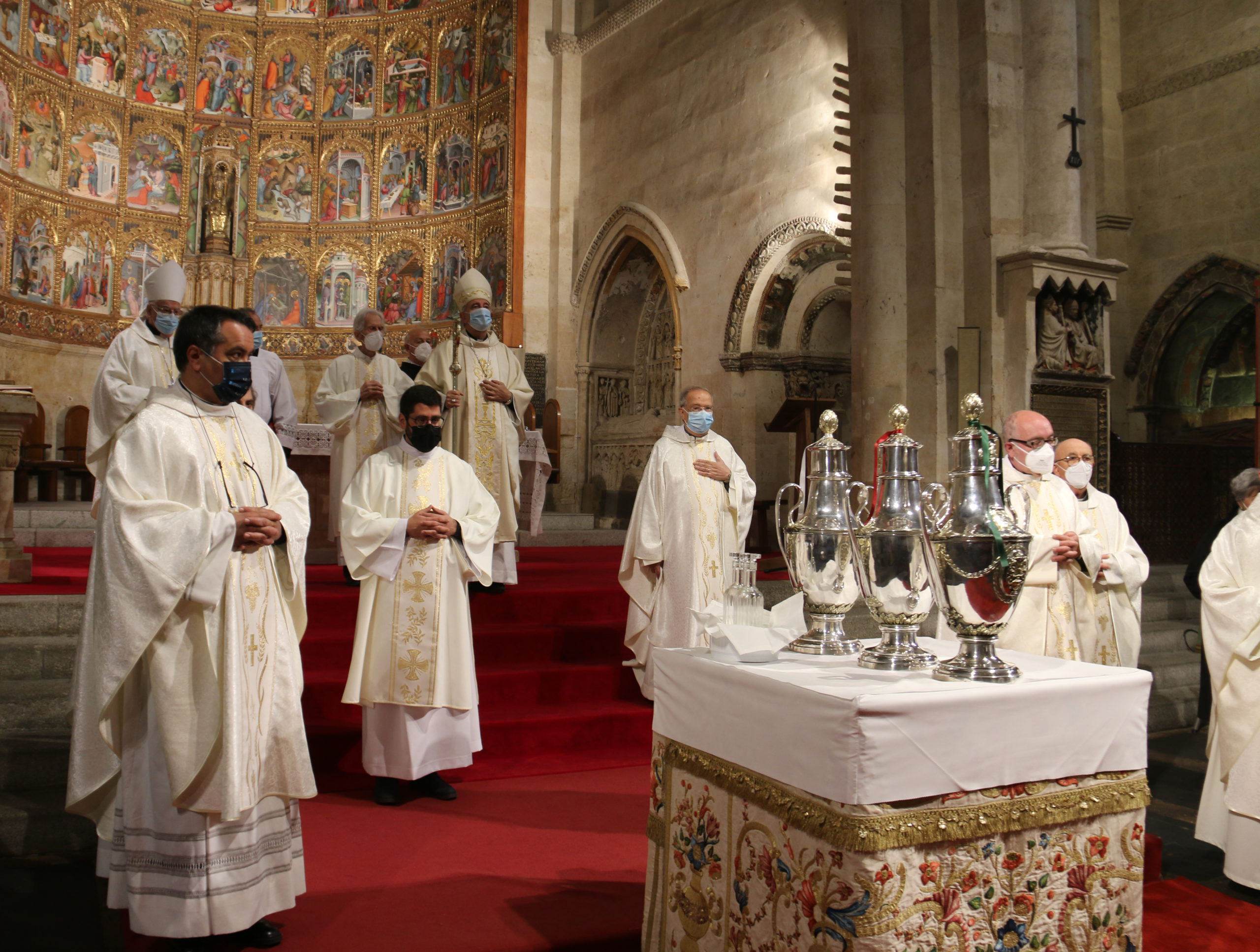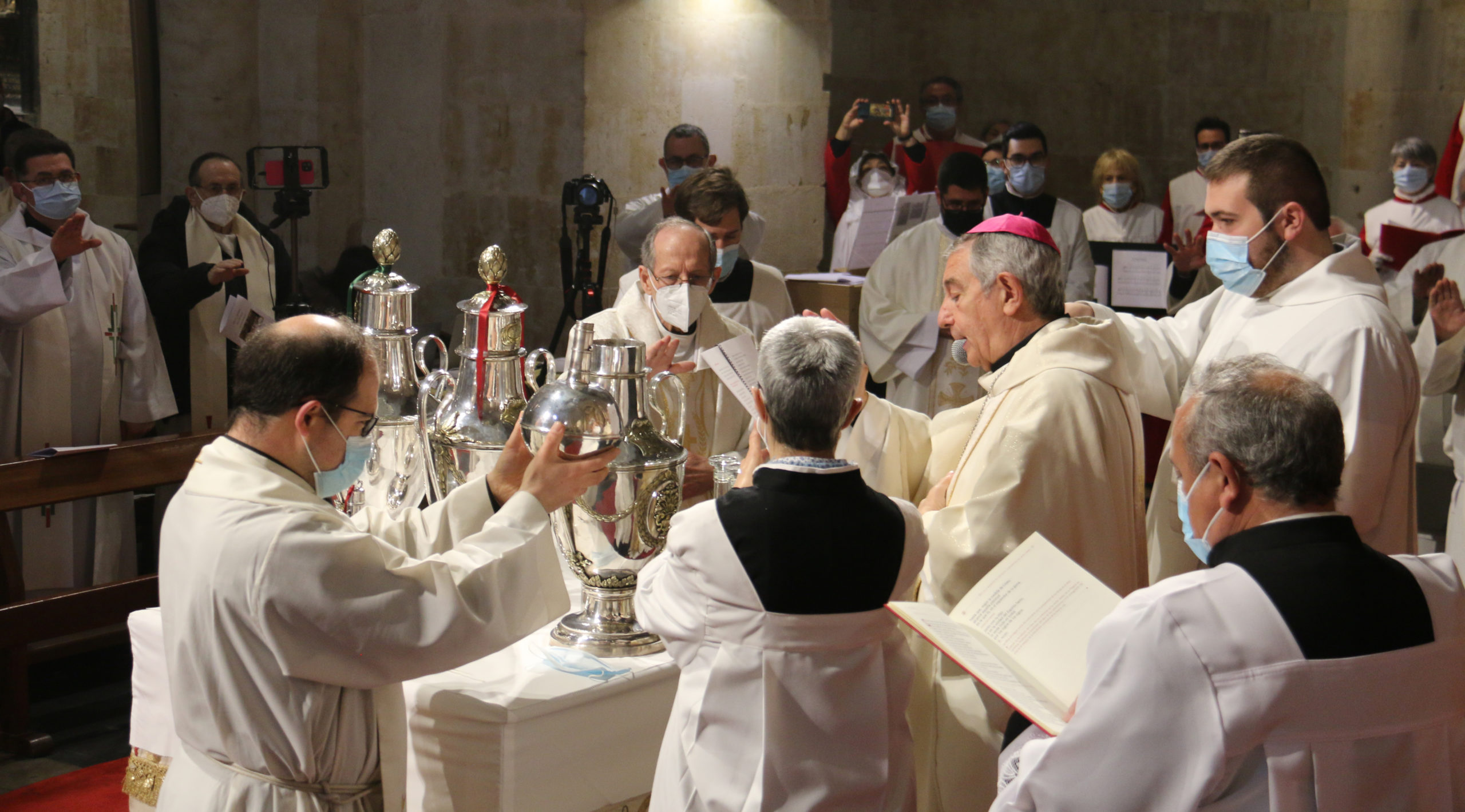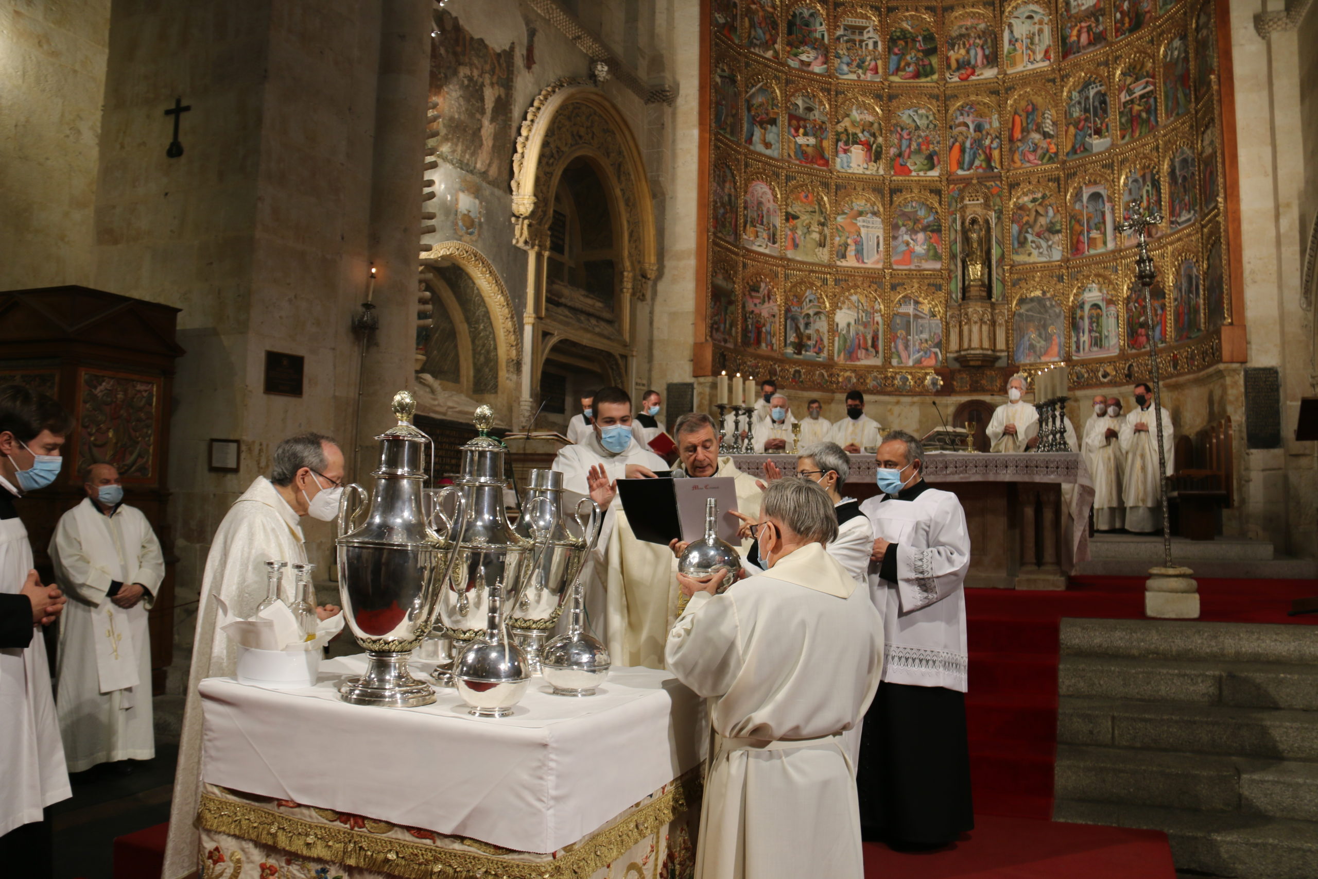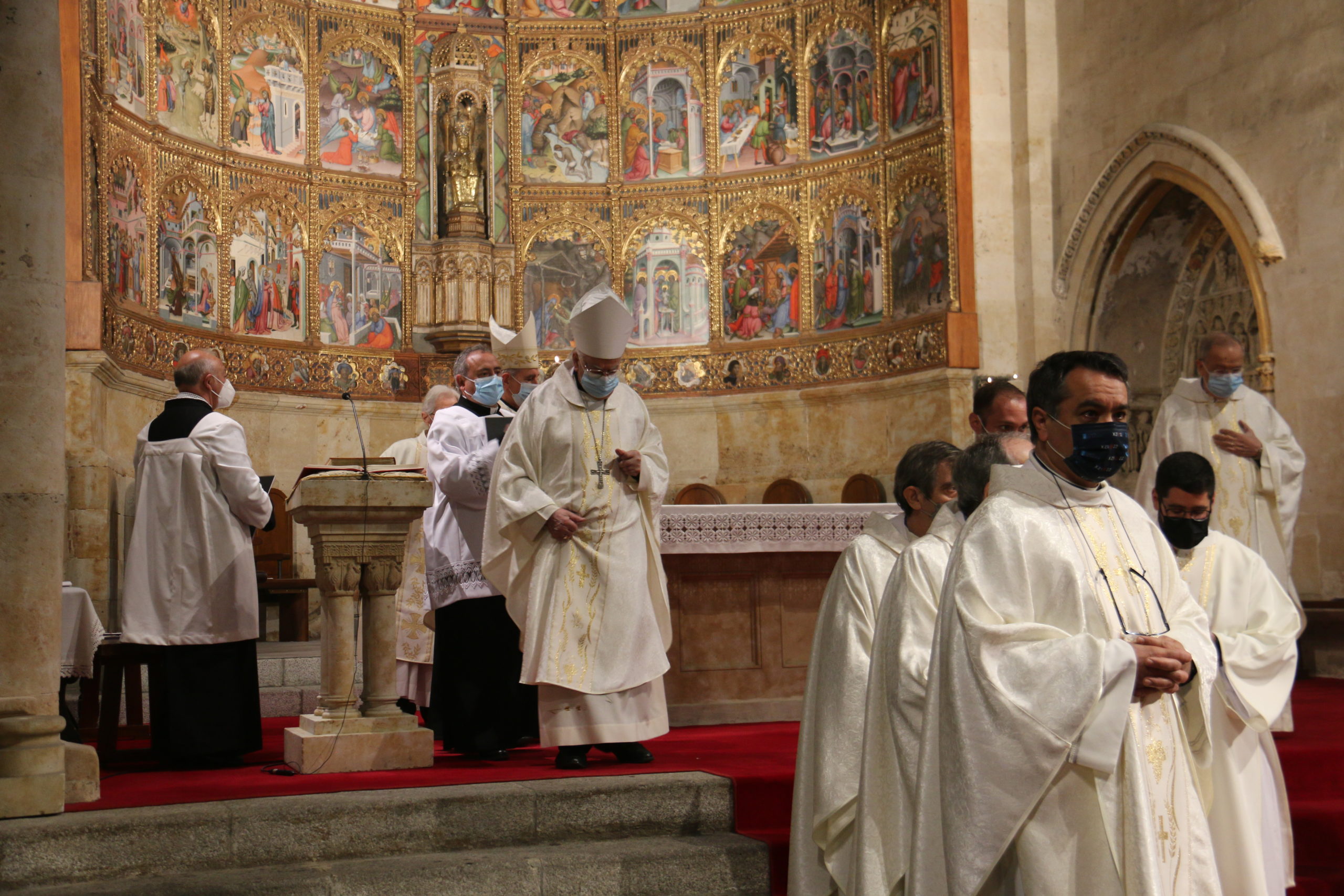 La Misa Crismal volvió a celebrarse este Miércoles Santo en la Catedral Vieja, tras los dos años de pandemia que obligaron a modificar el lugar de celebración. En esta ocasión, era la primera presidida por el actual obispo de la Diócesis de Salamanca, Mons. José Luis Retana, ante la presencia de la mayor parte del clero salmantino, que ha renovado sus promesas sacerdotales.