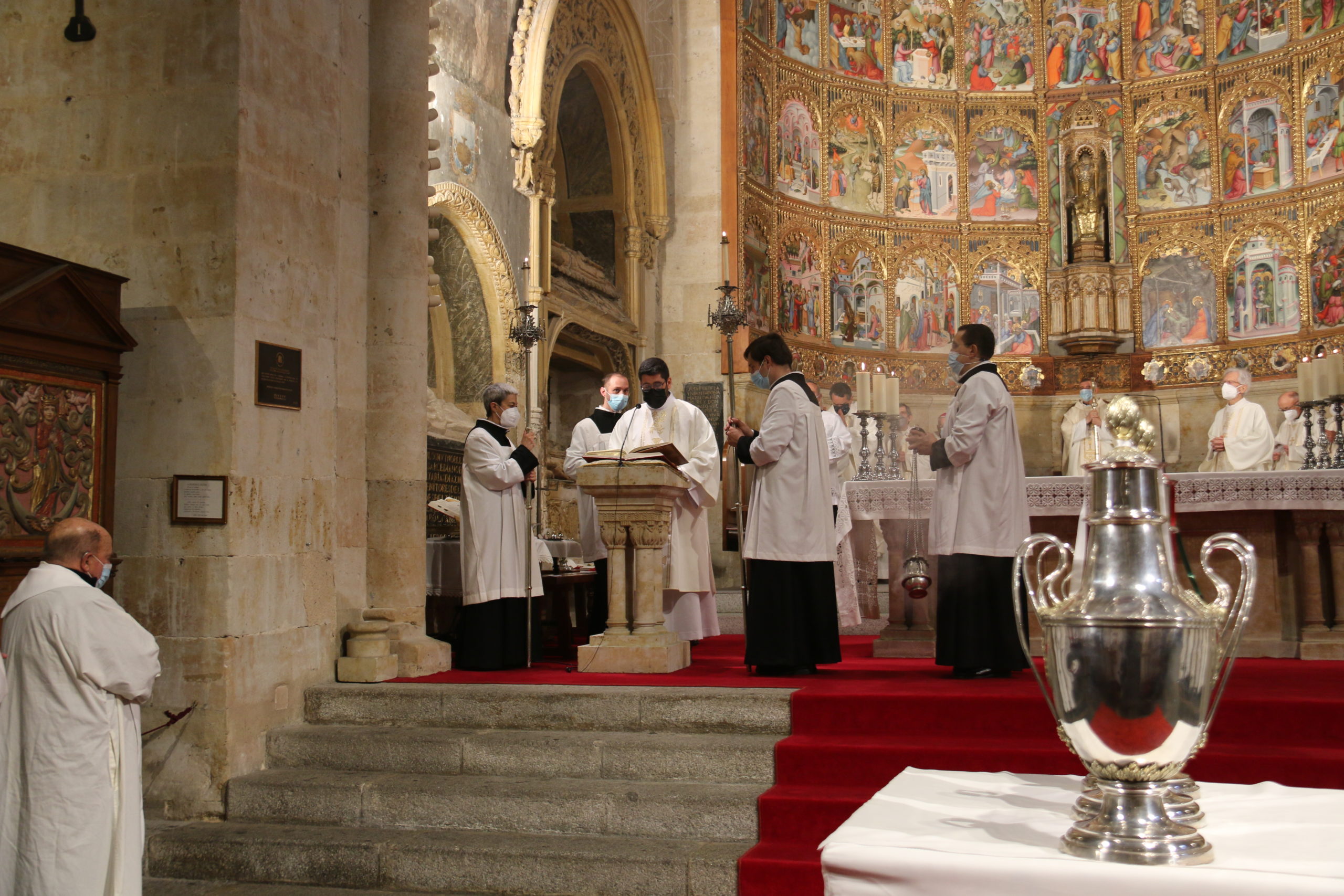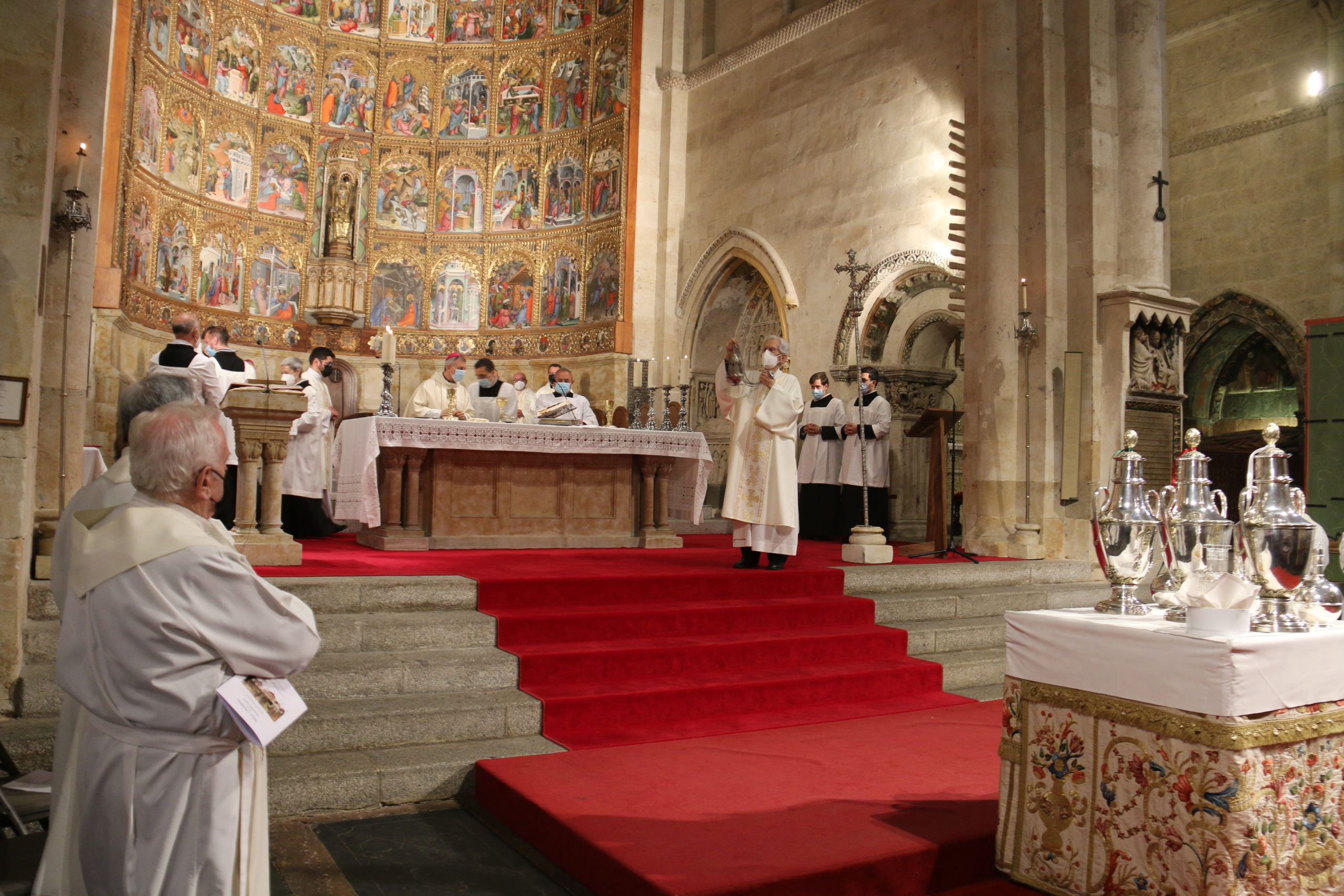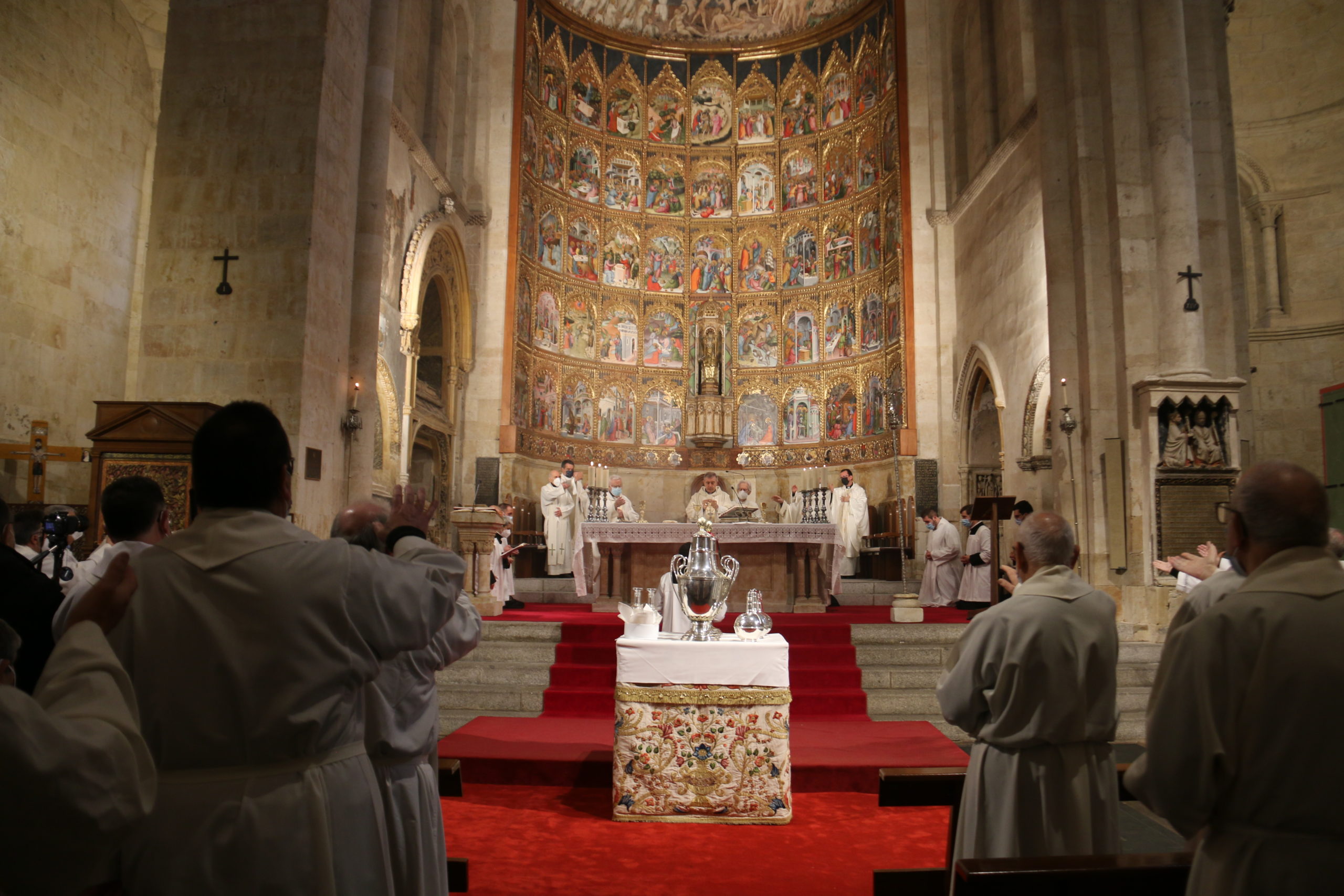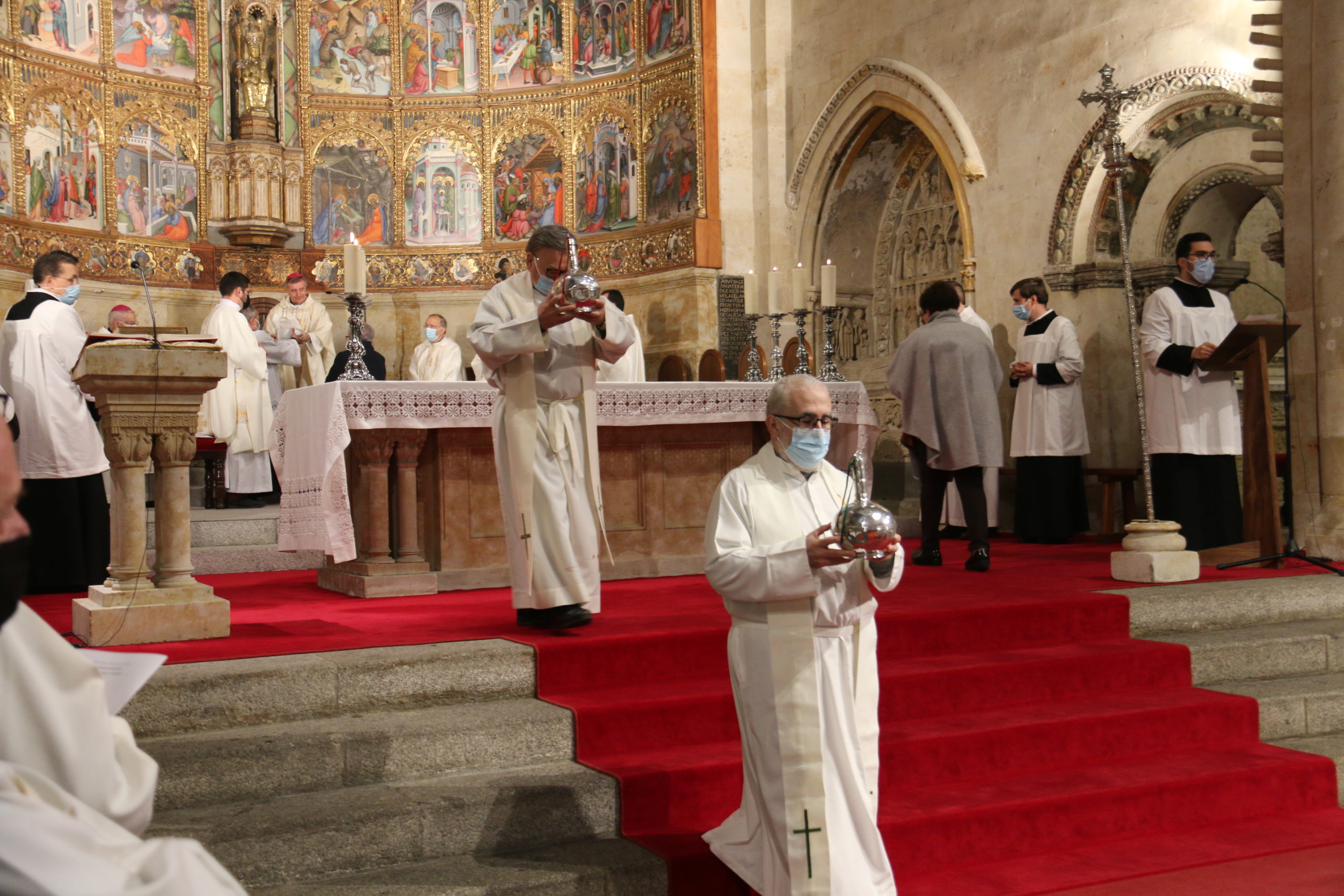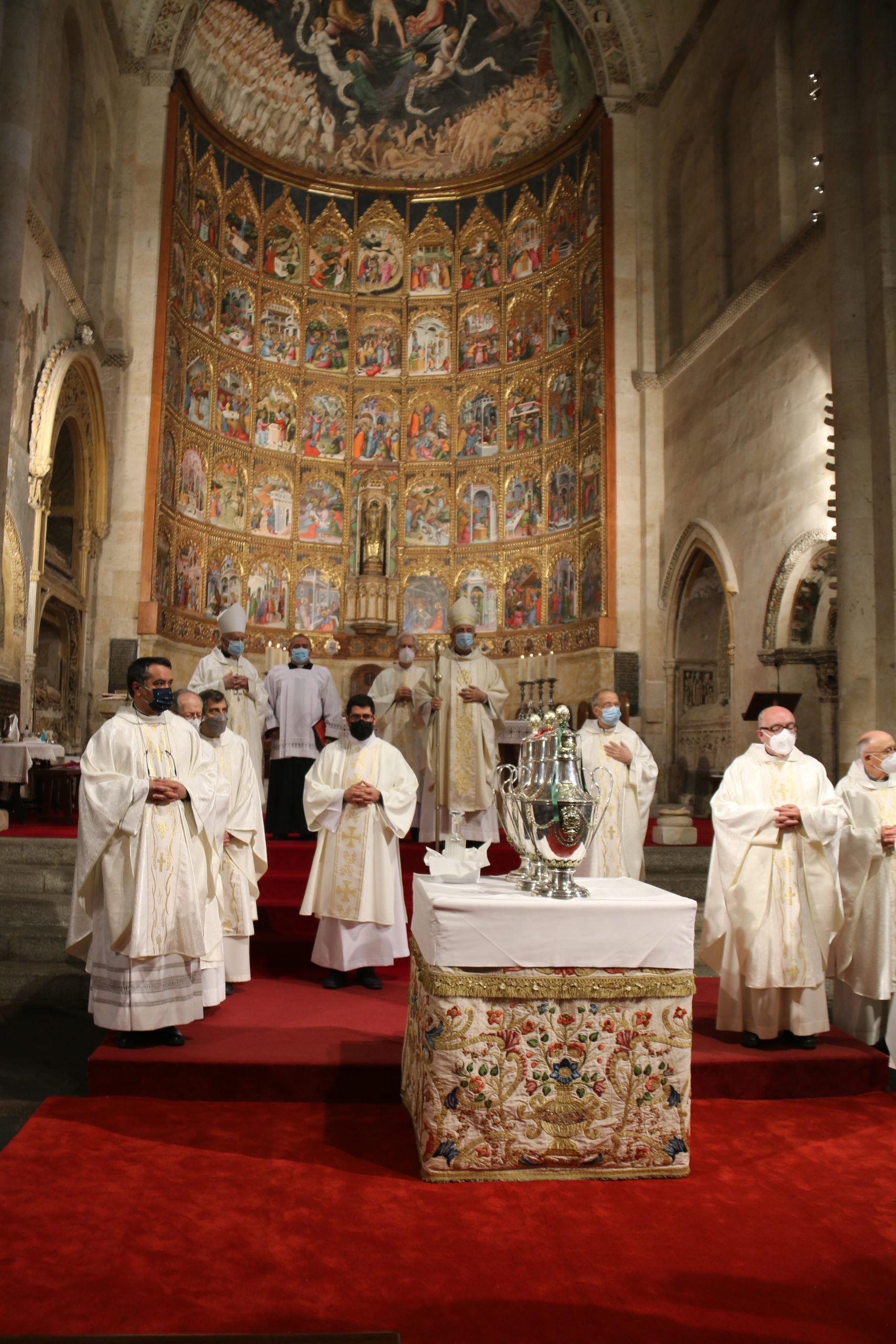 La Misa Crismal volvió a celebrarse este Miércoles Santo en la Catedral Vieja, tras los dos años de pandemia que obligaron a modificar el lugar de celebración. En esta ocasión, era la primera presidida por el actual obispo de la Diócesis de Salamanca, Mons. José Luis Retana, ante la presencia de la mayor parte del clero salmantino, que ha renovado sus promesas sacerdotales.