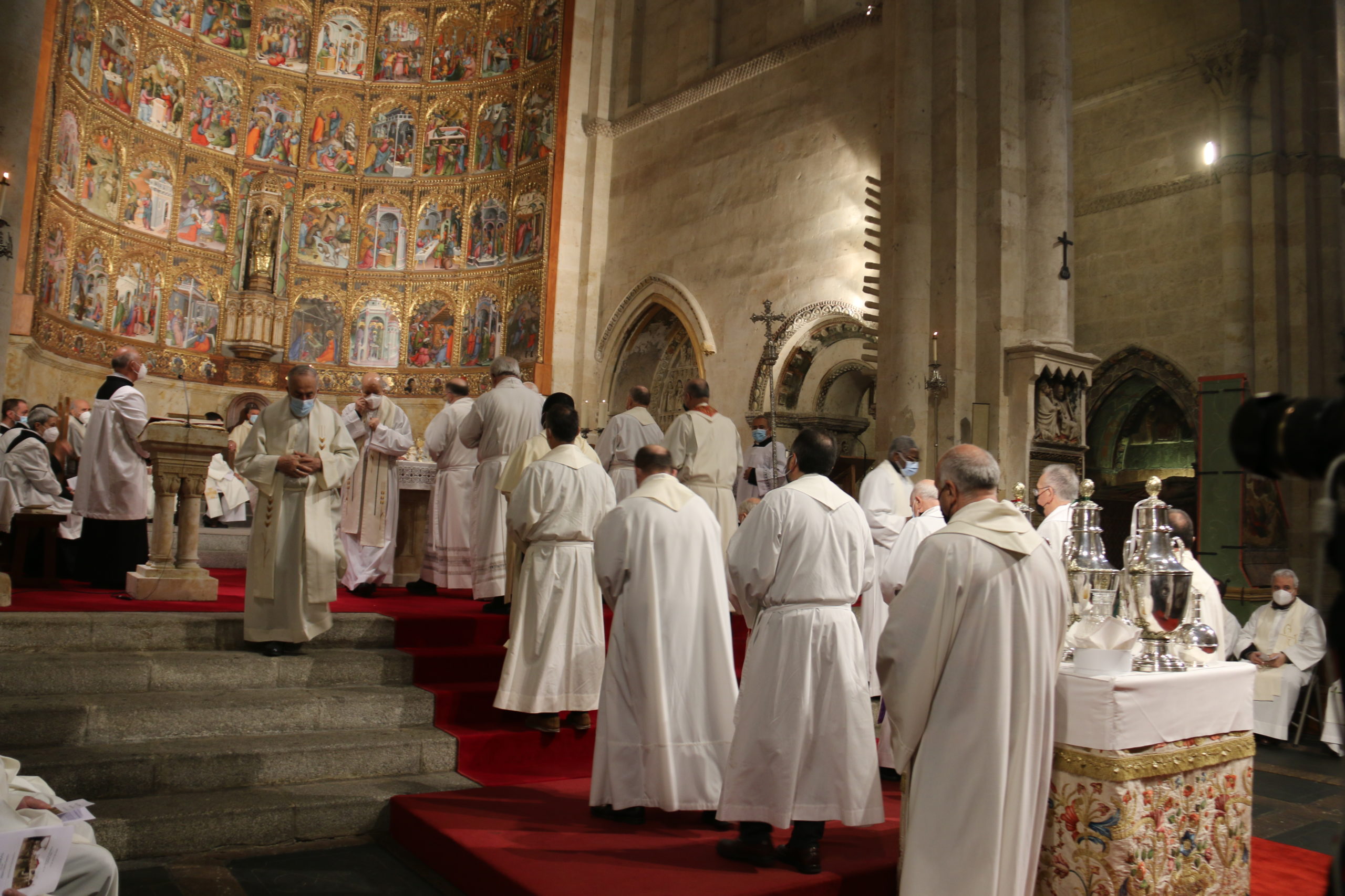 Y habló de los más jóvenes, “que queréis entregaros con docilidad y generosidad, sin arrogancia, sabiendo que en esta entrega está el gozo del Evangelio”. También mencionó a los que han venido de lejos de su tierra, “para compartir esta bella tarea de pastorear al Pueblo de Dios en nuestra querida Diócesis”.