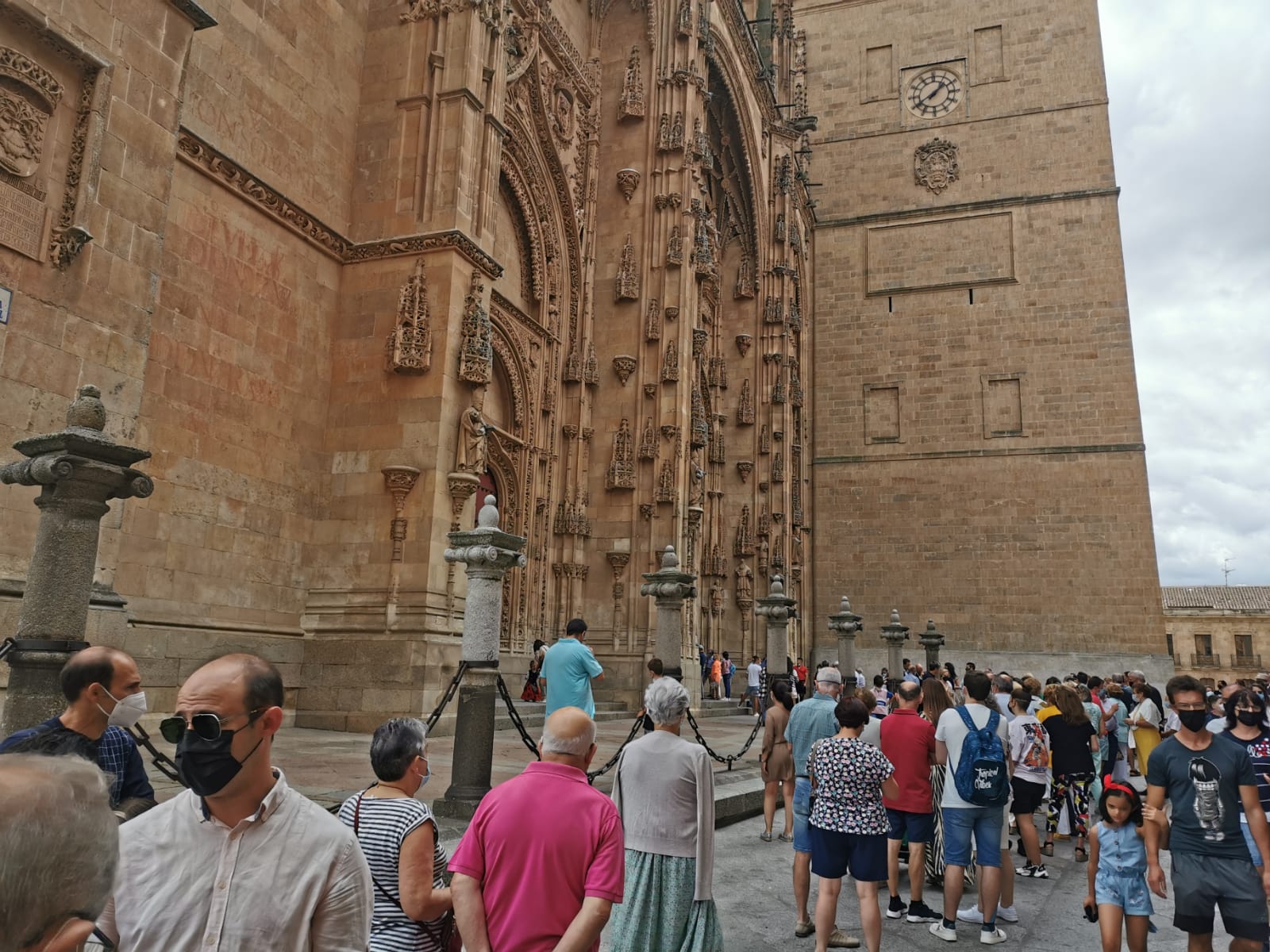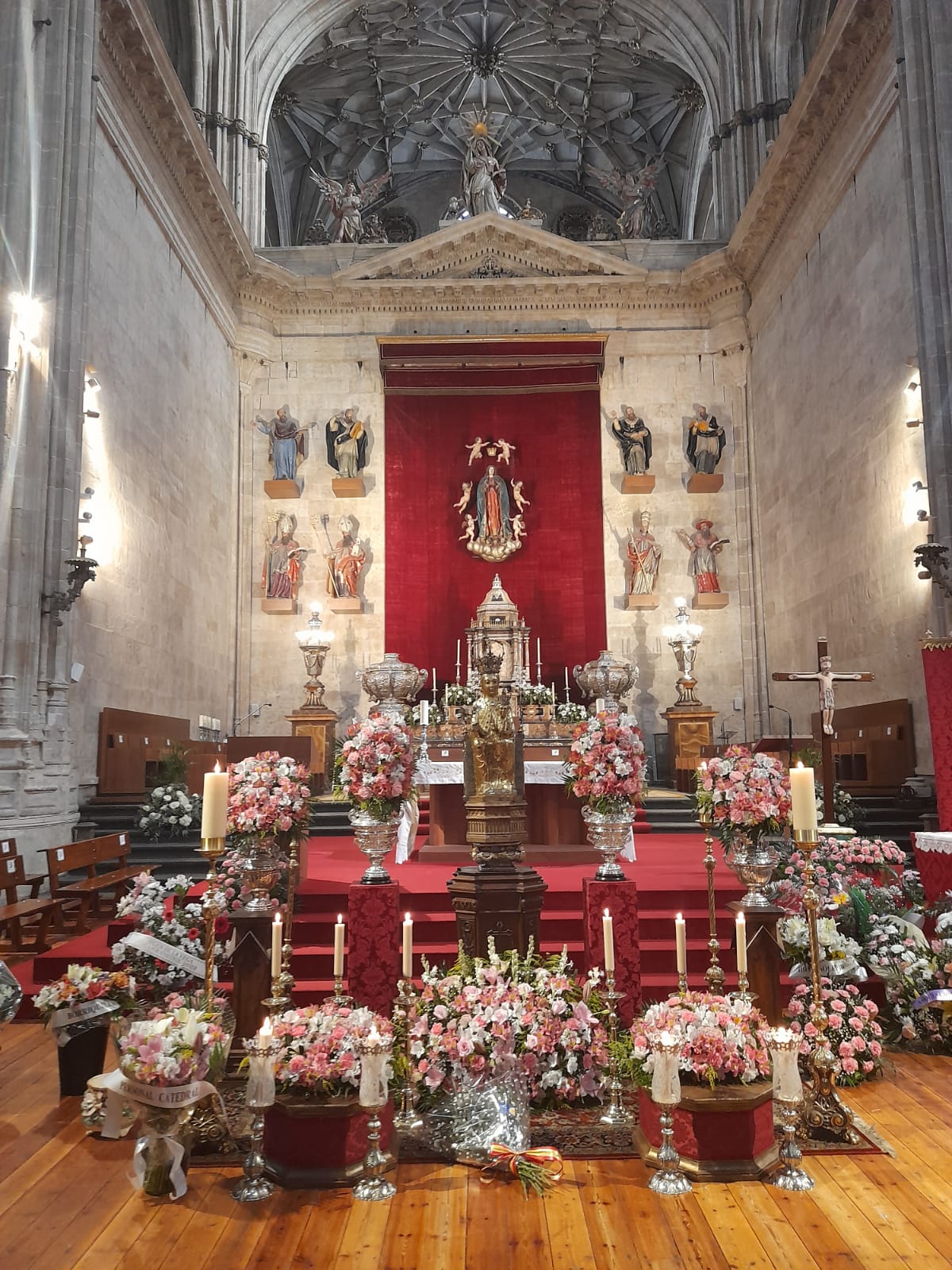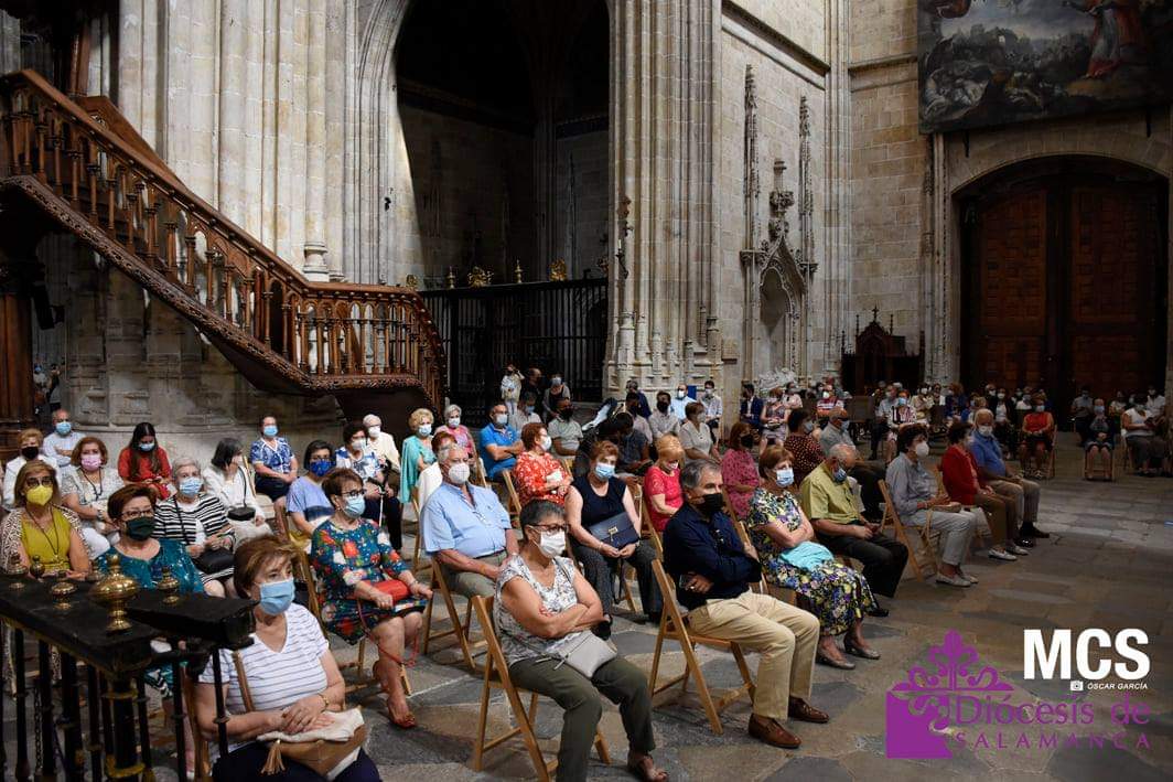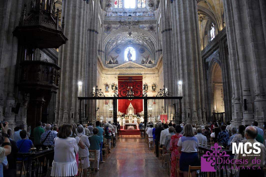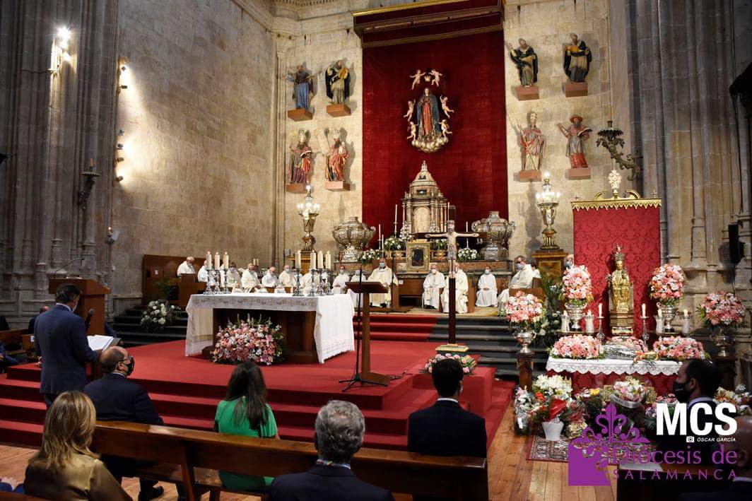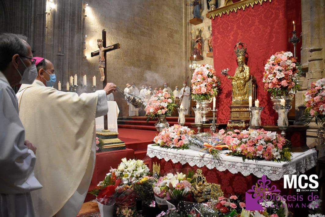 La celebración ha concluido con la bendición solemne y el canto del himno de la Virgen de la Vega, cuya imagen se ha ubicado después a los pies del altar mayor de la Catedral Nueva para la veneración pública de los fieles que se agolpaban a las puertas de la seo para ver a la Virgen y depositarle, a lo largo de toda la tarde, sus ofrendas.