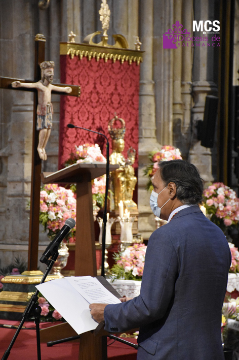 En la celebración también ha intervenido el alcalde de Salamanca, Carlos García Carbayo, quien ha manifestado a la patrona su agradecimiento de parte de todos los salmantinos por su “infinita bondad y generosidad”. “Tu protección nos llena de fuerza y de esperanza para vencer los desafíos que tenemos por delante”, ha subrayado en su ofrenda a la Virgen.