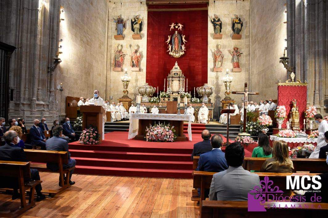 Antes de finalizar su predicación, el prelado salmantino ha señalado que “también en el actual desierto espiritual siempre hay granos que llegan a dar fruto” como “la siembra que el discípulo misionero hace de sí mismo, a semejanza de Jesús, el grano de trigo que cae en tierra y muere”. Y ha manifestado que “necesitamos suplicar la fe y la gracia del Espíritu Santo, que todo lo hace nuevo y es fuente de luz libertad y esperanza” para “volver a las huellas de Jesús”. Y dirigíendose a la Virgen ha proclamado esta oración: “María, madre de Dios y madre nuestra, eres consuelo y esperanza del pueblo de Salamanca. Nos dirigimos a ti rogándote, estrella de la evangelización, ayúdanos a resplandecer en el testimonio de la comunión en la fe y el amor, del servicio, de la fe ardiente y generosa, de la justicia y del amor a los pobres para que la alegría del evangelio llegue hasta los confines de la tierra y ninguna situación humana esté privada de su luz. Madre del evangelio viviente, manantial de alegría para los humildes, ruega por nosotros”.